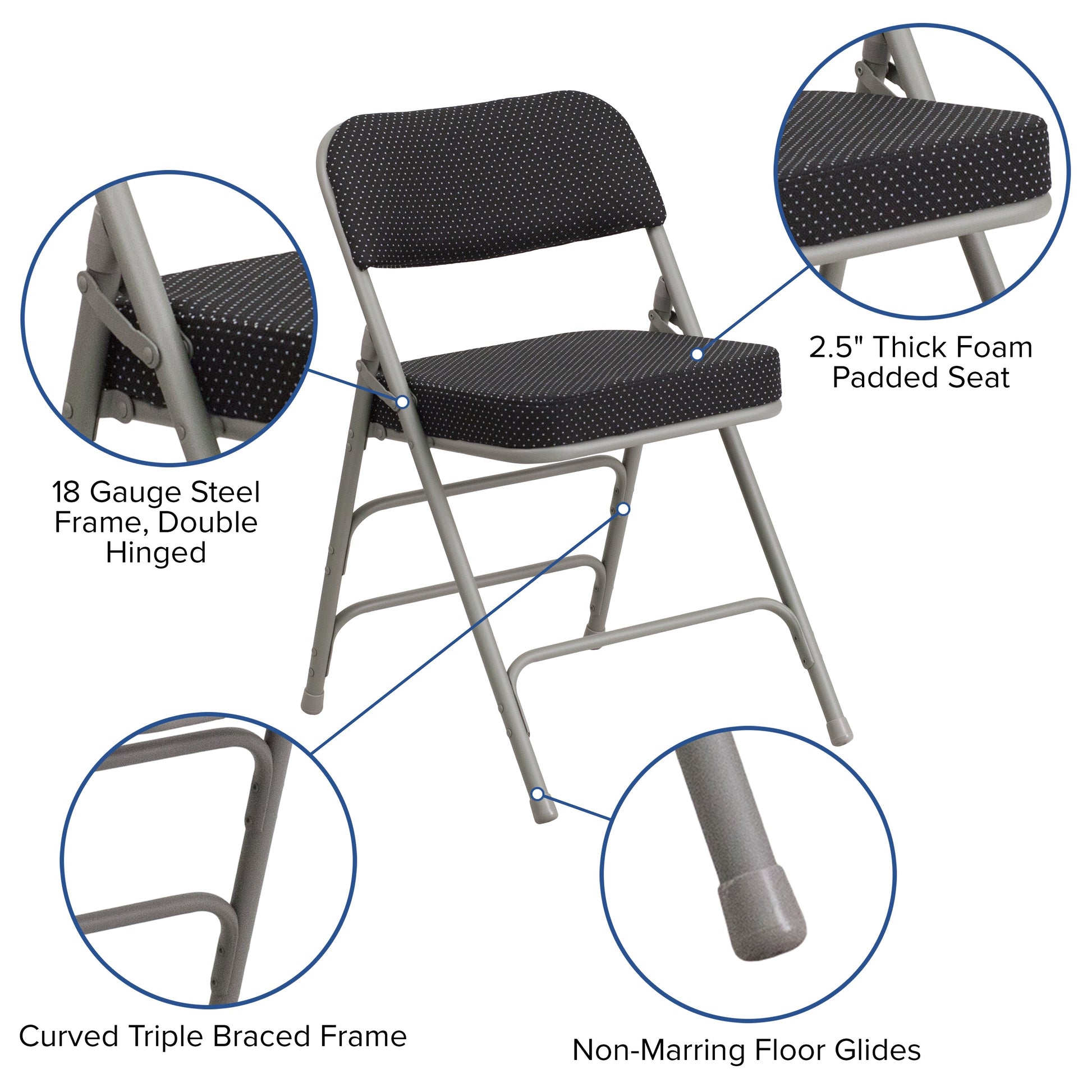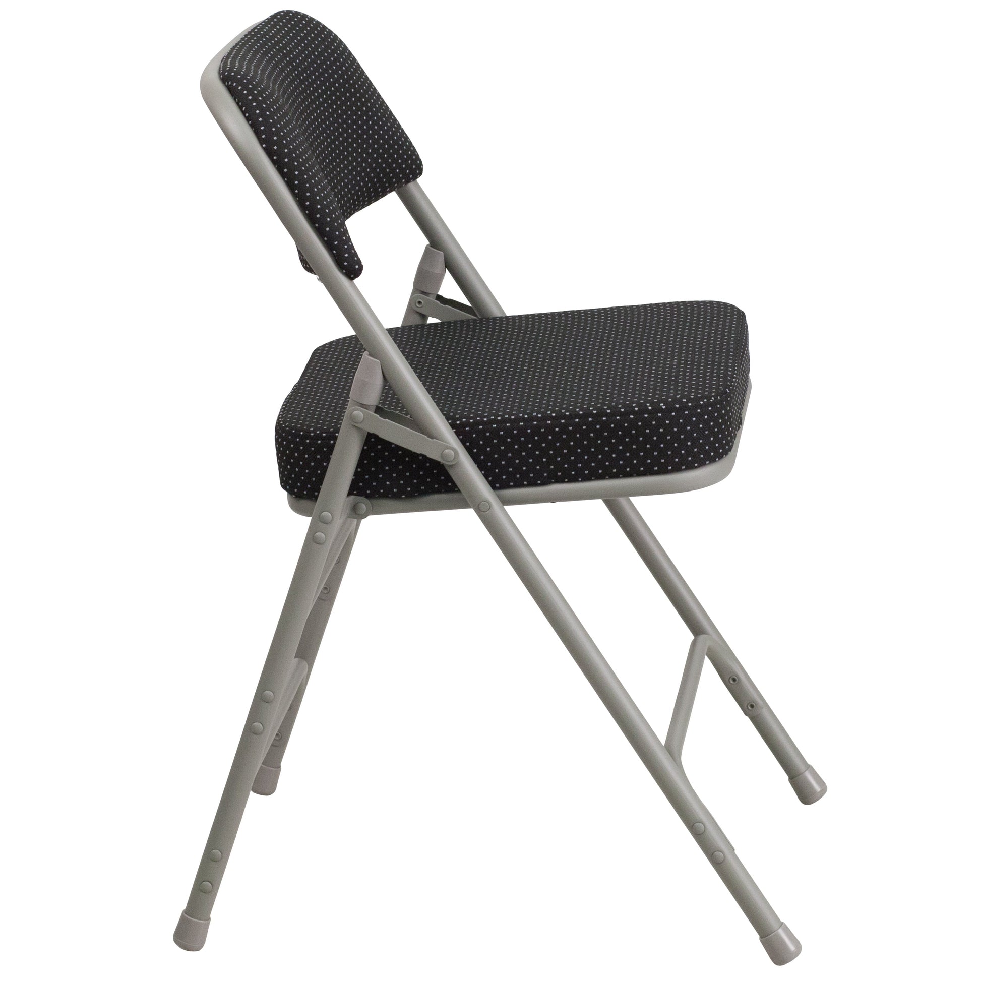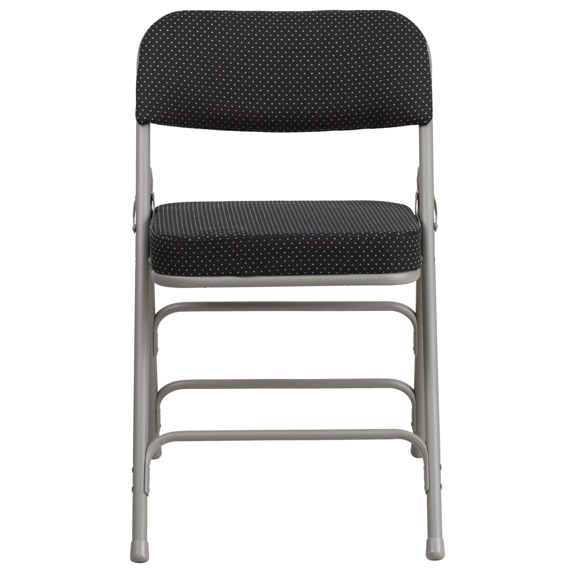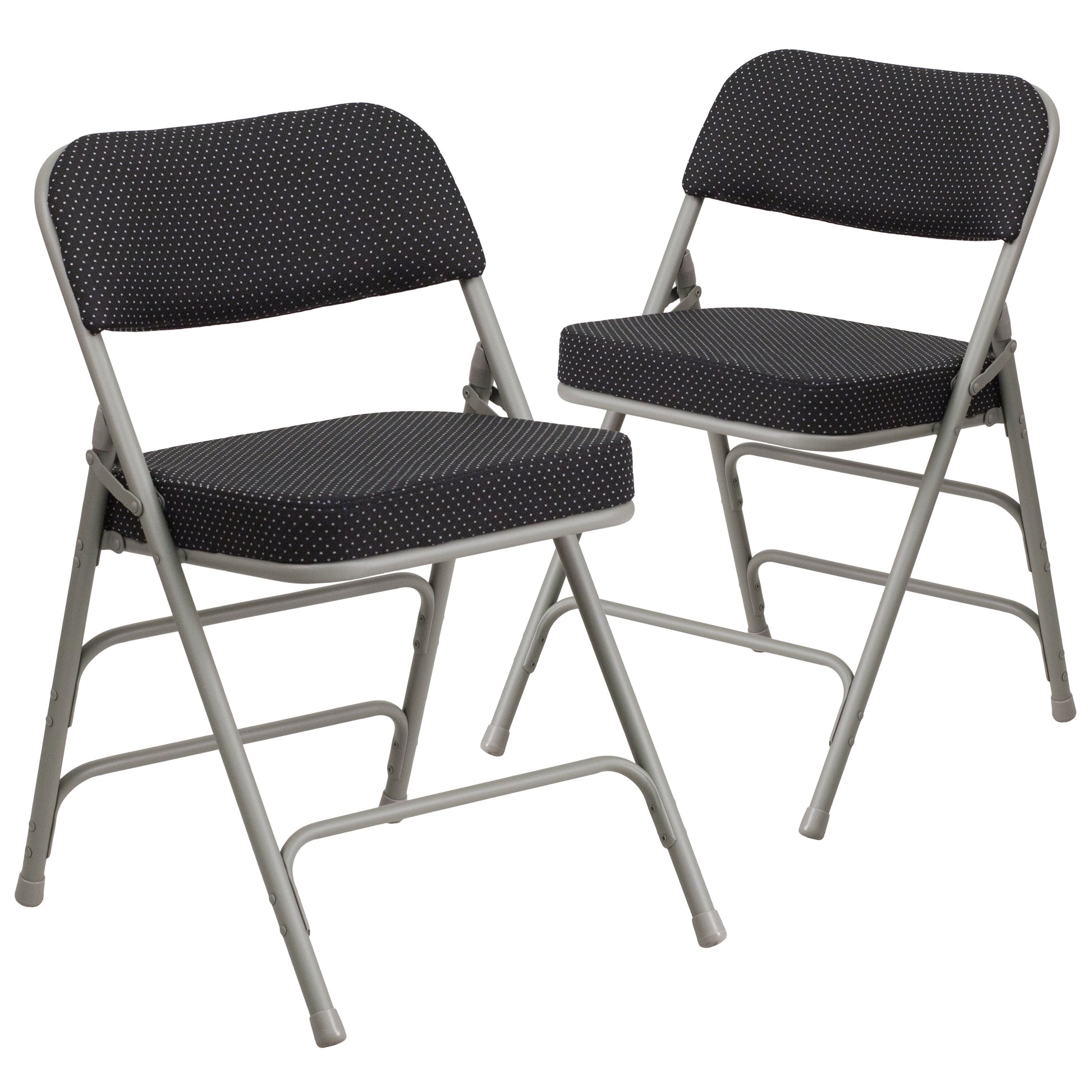 2 Pack HERCULES Series Premium Curved Triple Braced & Double Hinged Black Pin-Dot Fabric Metal Folding Chair Dimensions: 18"W x 20"D x 29.5"H