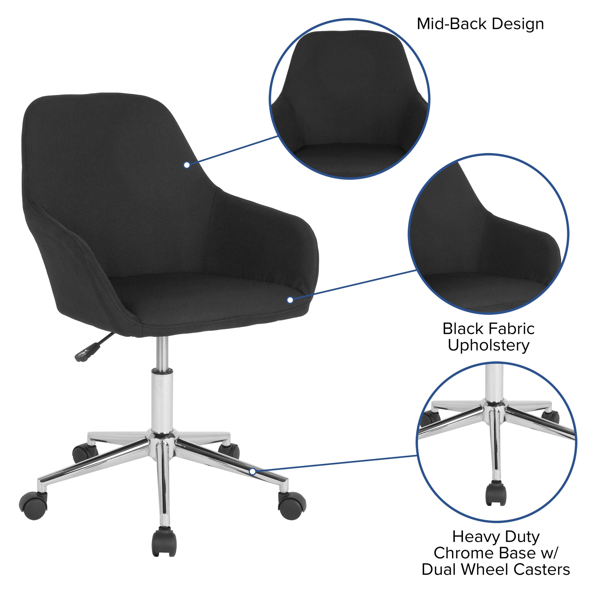 Cortana Home and Office Mid-Back Chair in Black Fabric Dimensions: 25"W x 25"D x 33.5" - 38.5"H