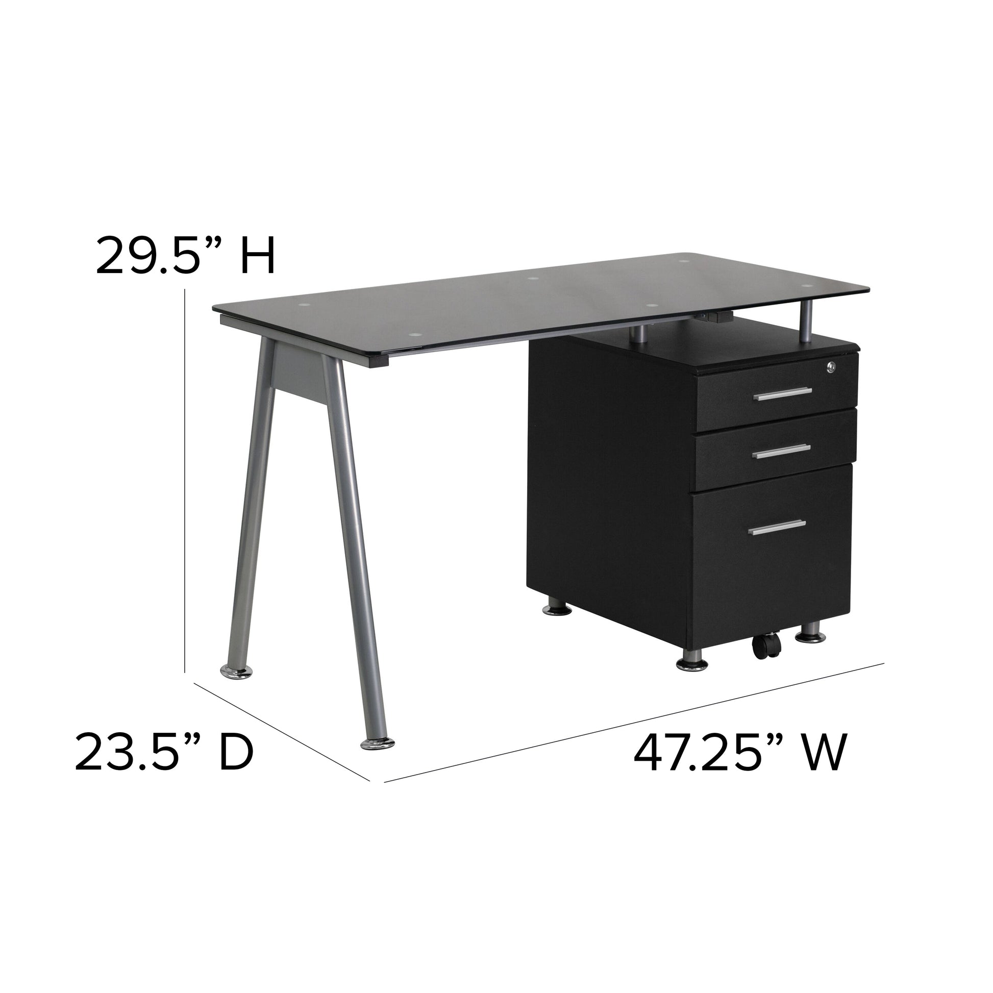 Singleton Black Glass Computer Desk with Three Drawer Pedestal Dimensions: 47.25"W x 23.5"D x 29.5"H