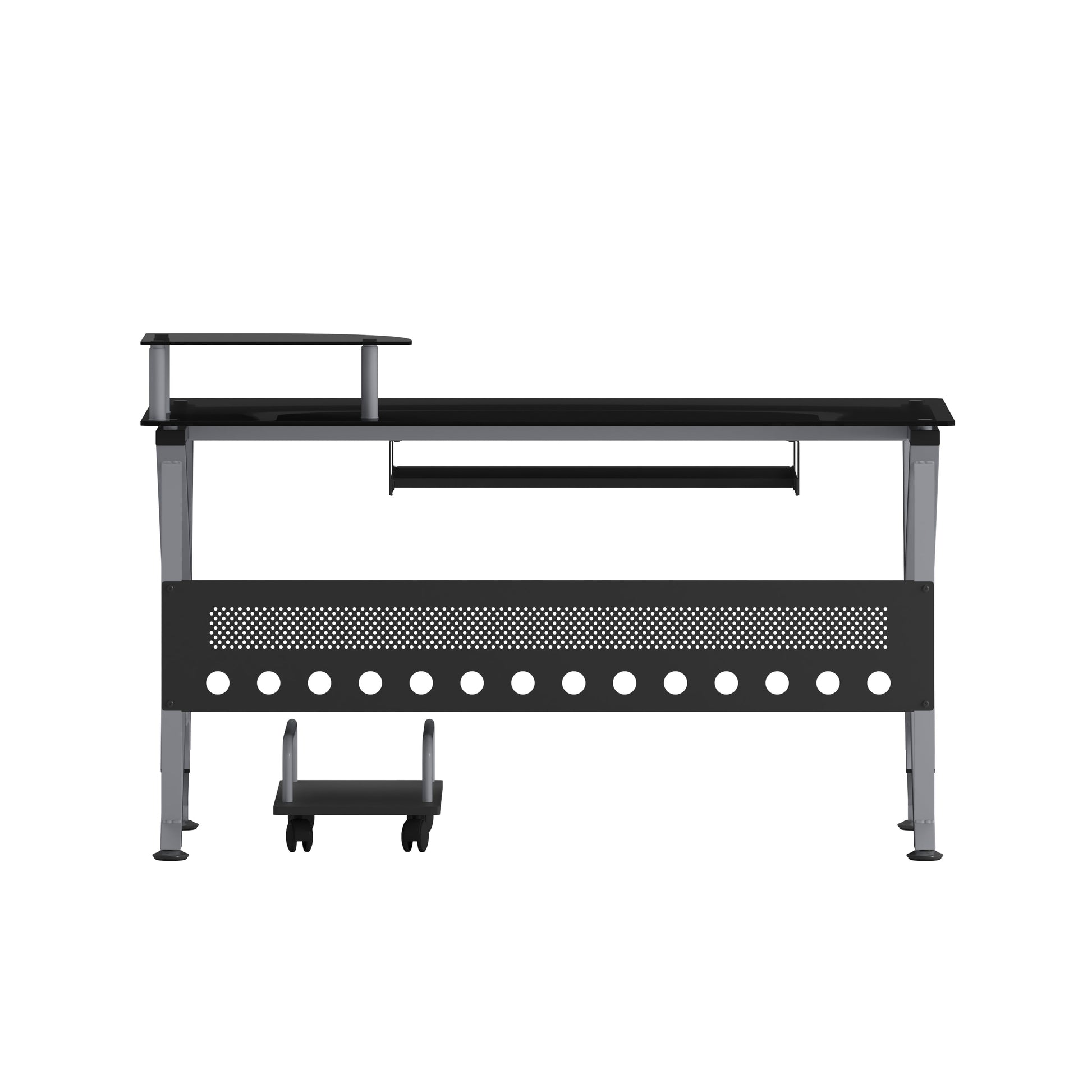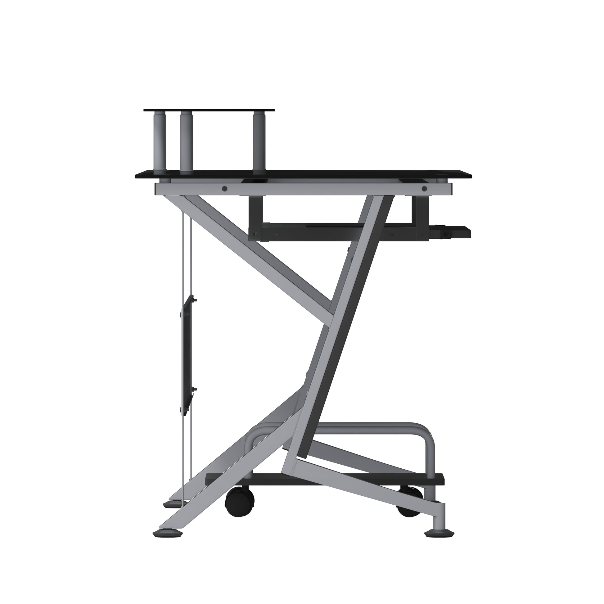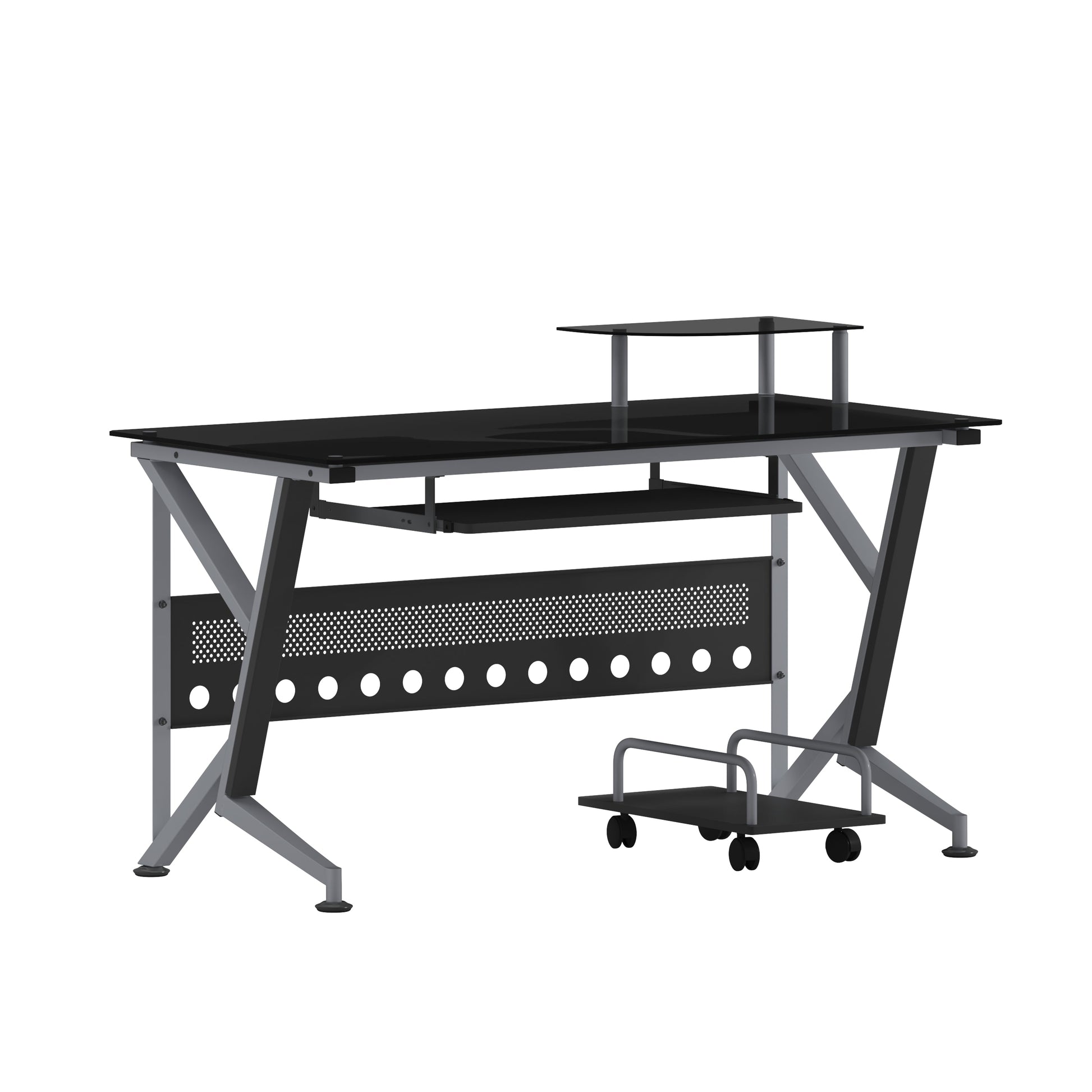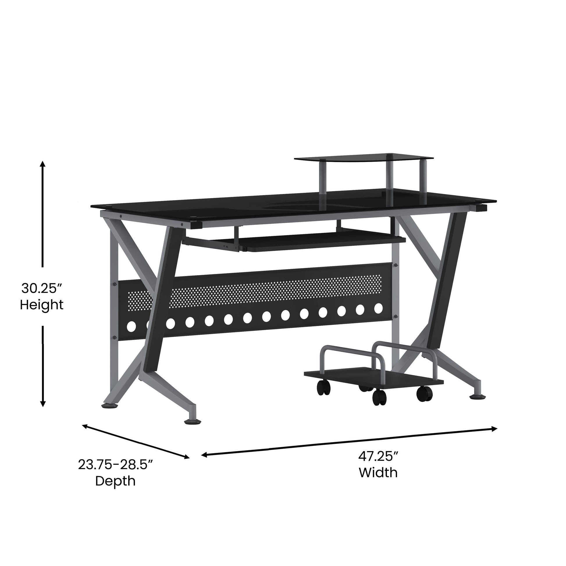 Singleton Black Glass Computer Desk with Pull-Out Keyboard Tray and CPU Cart Dimensions: 47.25"W x 23.75" - 28.5"D x 30.25"H