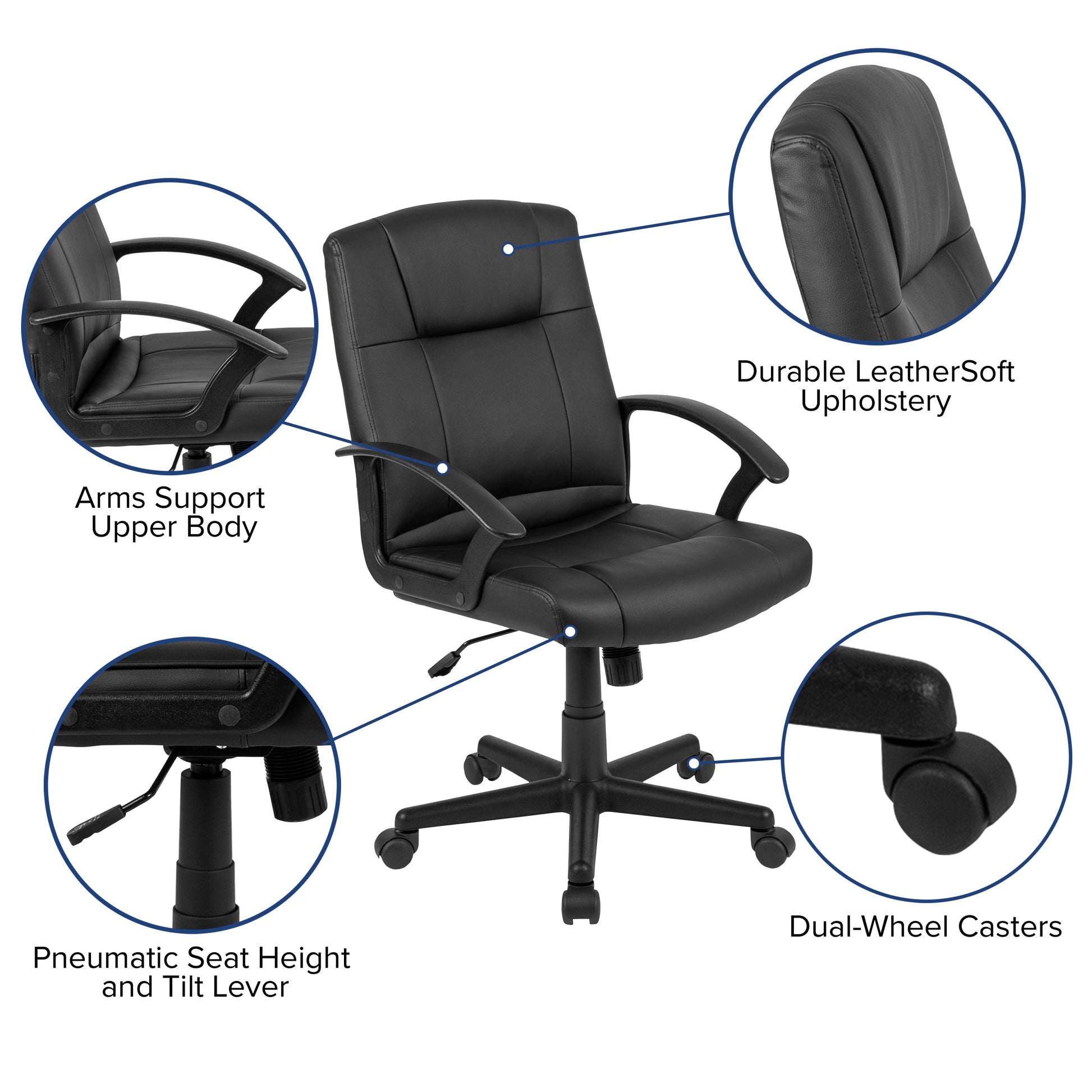 Coffman Flash Fundamentals Mid-Back Black LeatherSoft-Padded Task Office Chair with Arms Dimensions: 25"W x 25"D x 35.5" - 39.5"H