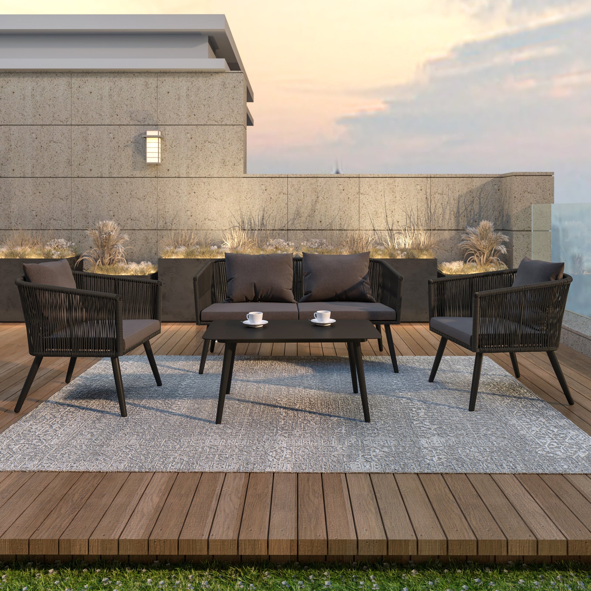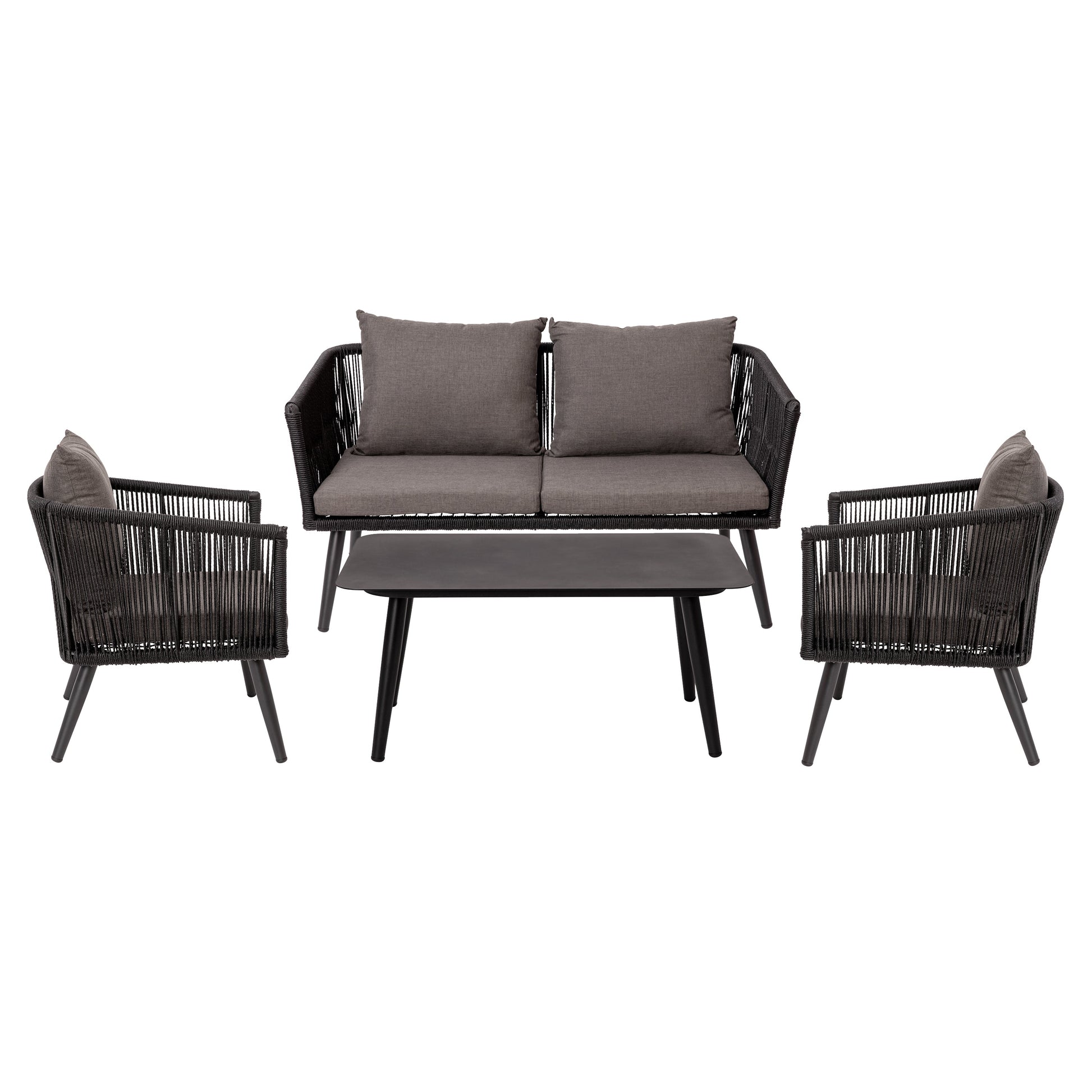 Kierra Black All-Weather 4-Piece Woven Conversation Set with Gray Zippered Removable Cushions & Metal Coffee Table Dimensions: 24.75" - 54"W x 25.5"D x 27.25" - 27.5"H