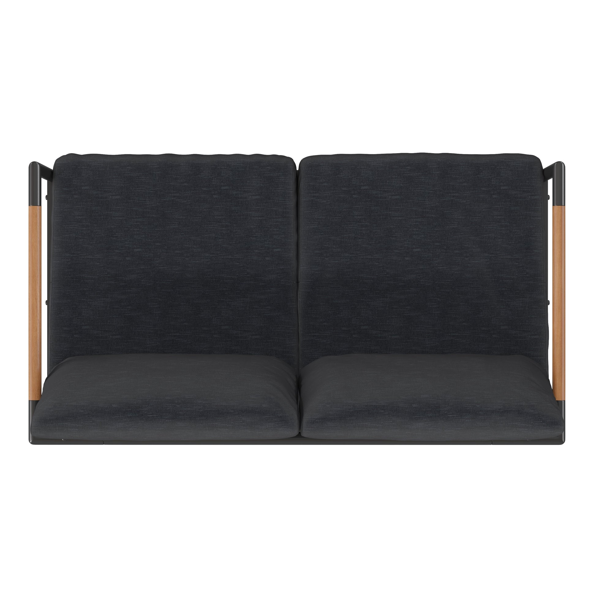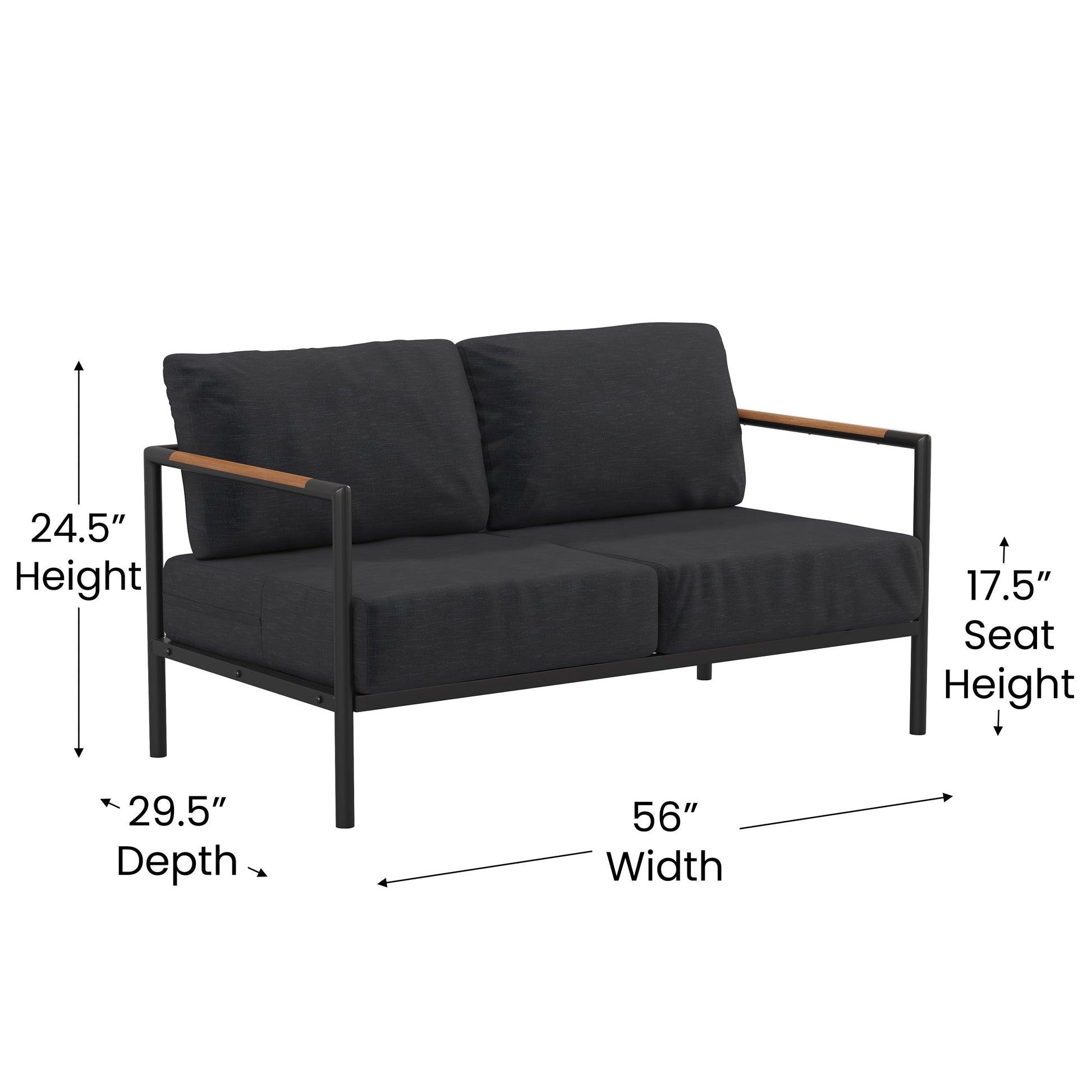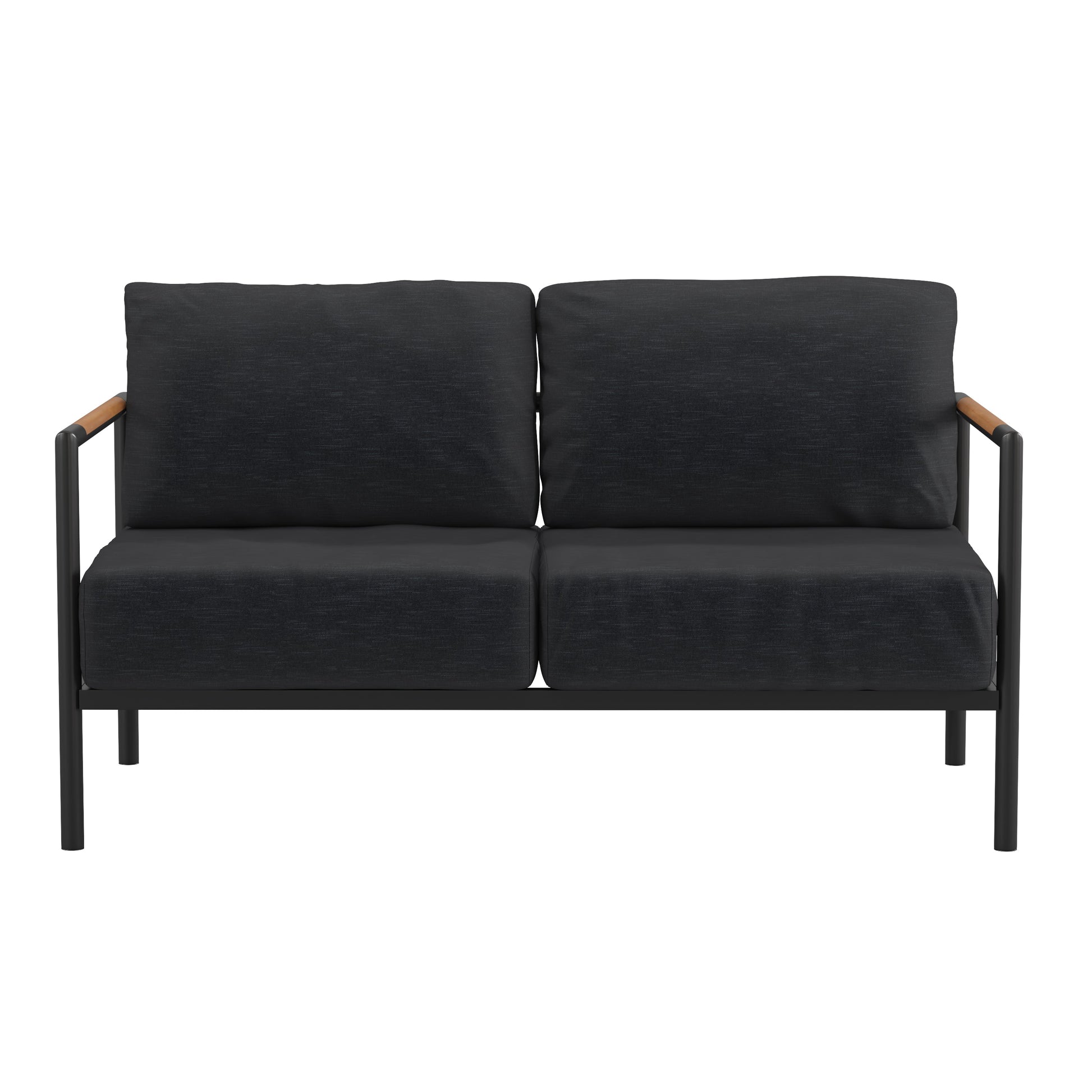 Lea Indoor/Outdoor Patio Loveseat with Cushions - Modern Aluminum Framed Loveseat with Teak Accent Arms, Black-Charcoal Cushions Dimensions: 56"W x 29.25"D x 24.5"H