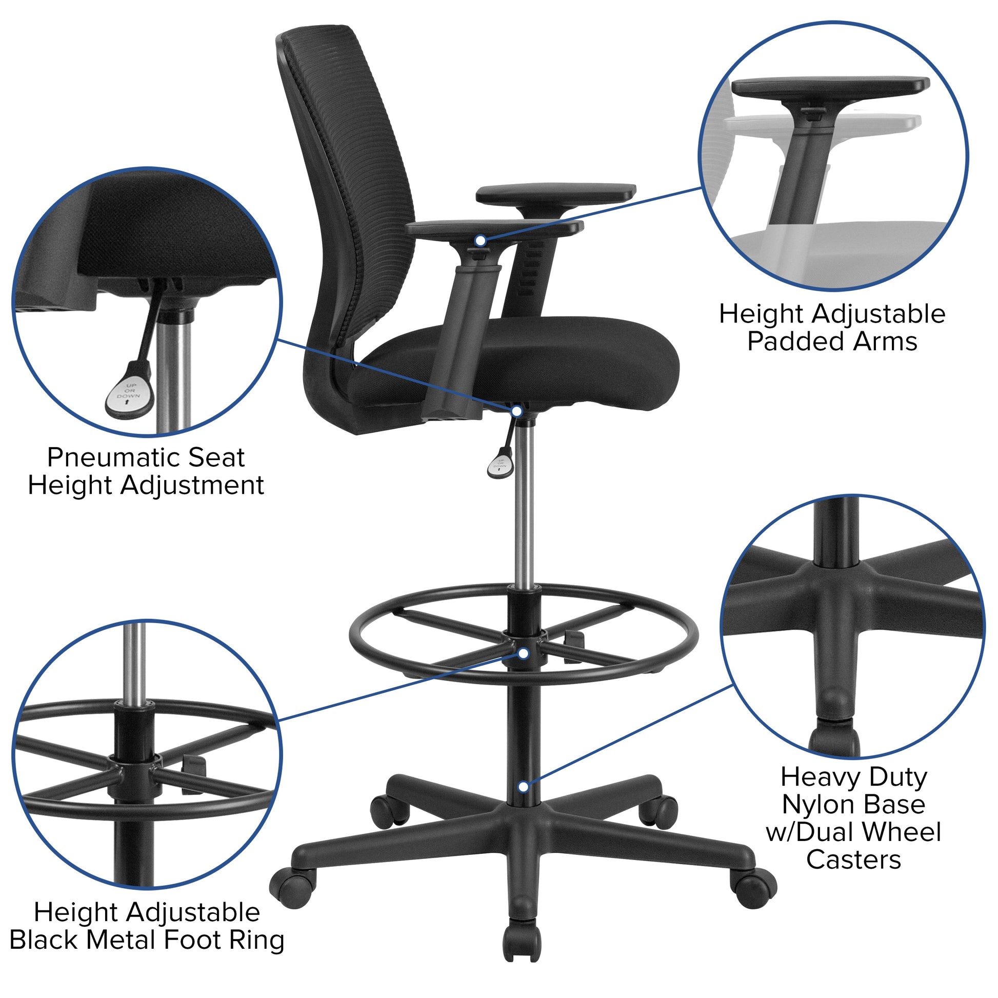 Harper Ergonomic Mid-Back Mesh Drafting Chair with Black Fabric Seat, Adjustable Foot Ring and Adjustable Arms Dimensions: 26.25"W x 26"D x 43" - 49.25"H