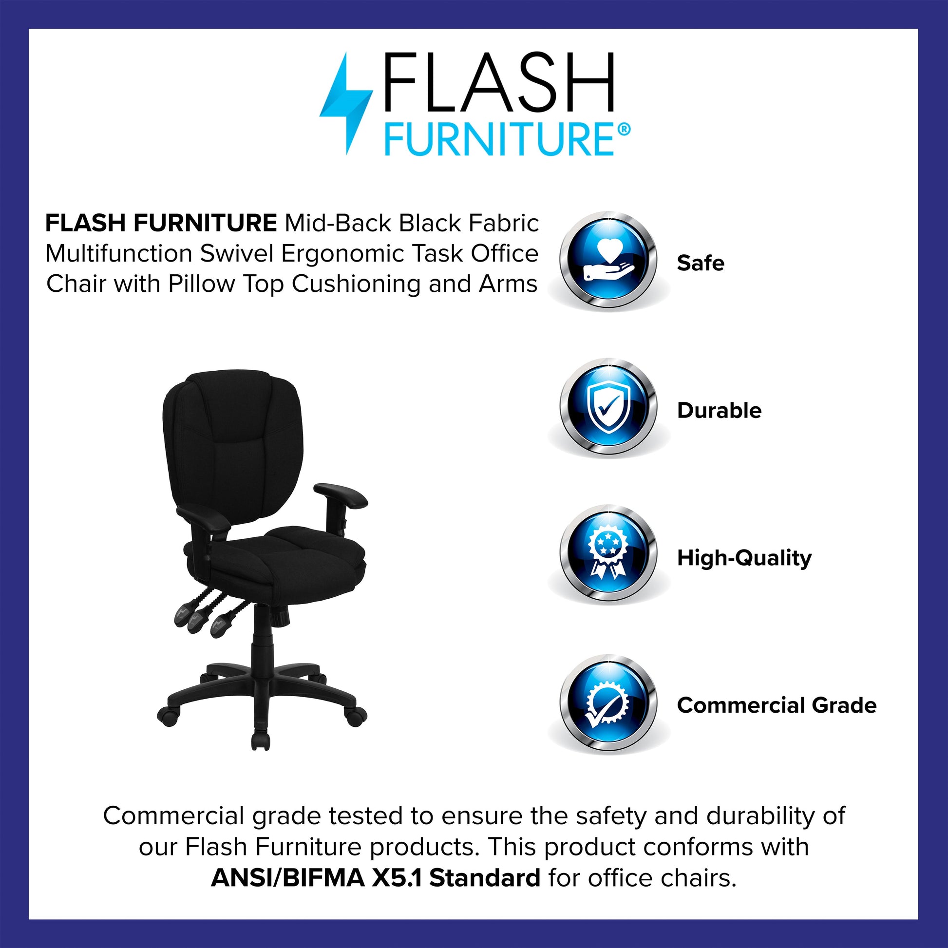 Caroline Mid-Back Black Fabric Multifunction Swivel Ergonomic Task Office Chair with Pillow Top Cushioning and Arms Dimensions: 19.75"W x 25.75"D x 35" - 41"H