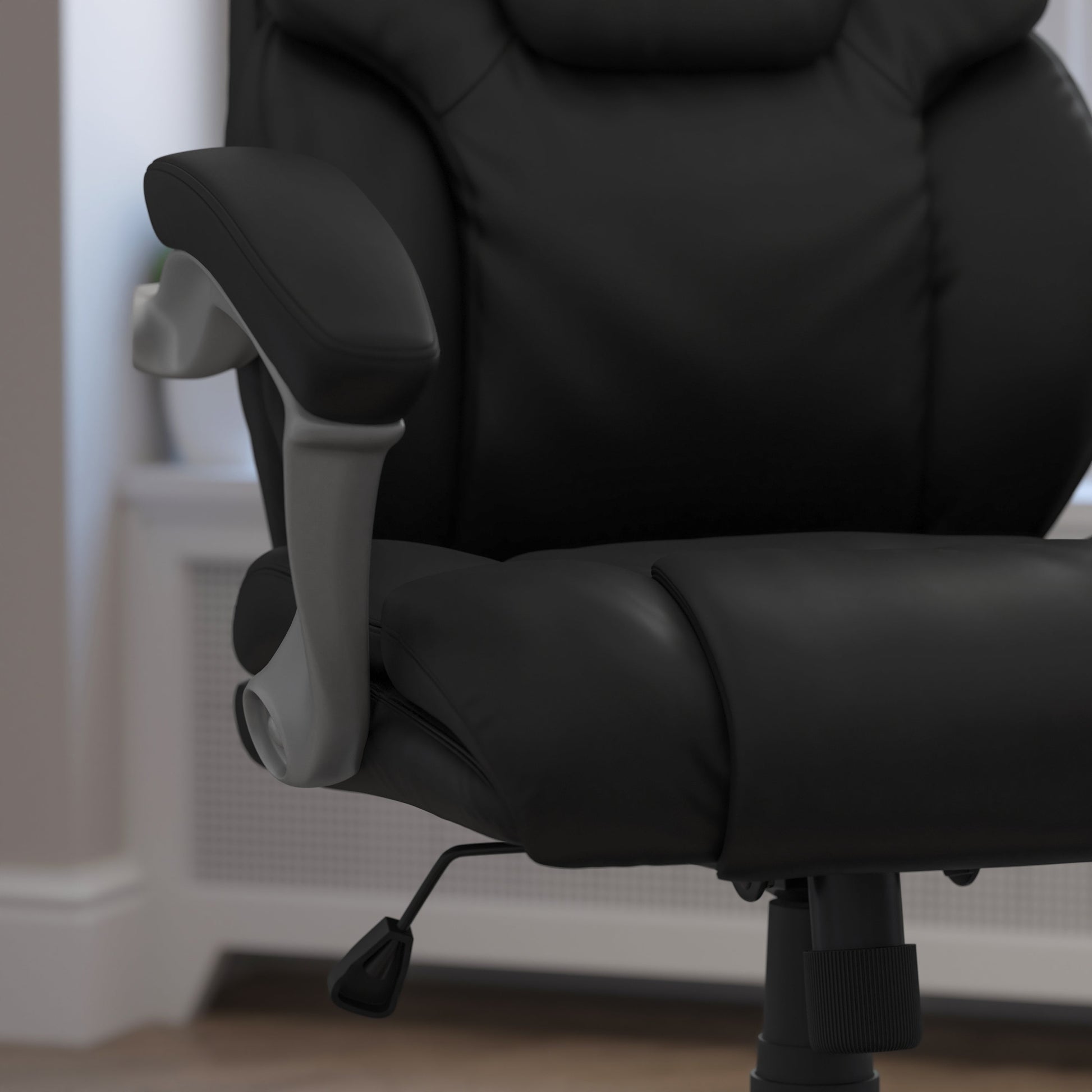 Heather Mid-Back Black LeatherSoft Layered Upholstered Executive Swivel Ergonomic Office Chair with Silver Nylon Base and Arms Dimensions: 27.5"W x 26"D x 37.5" - 41.5"H