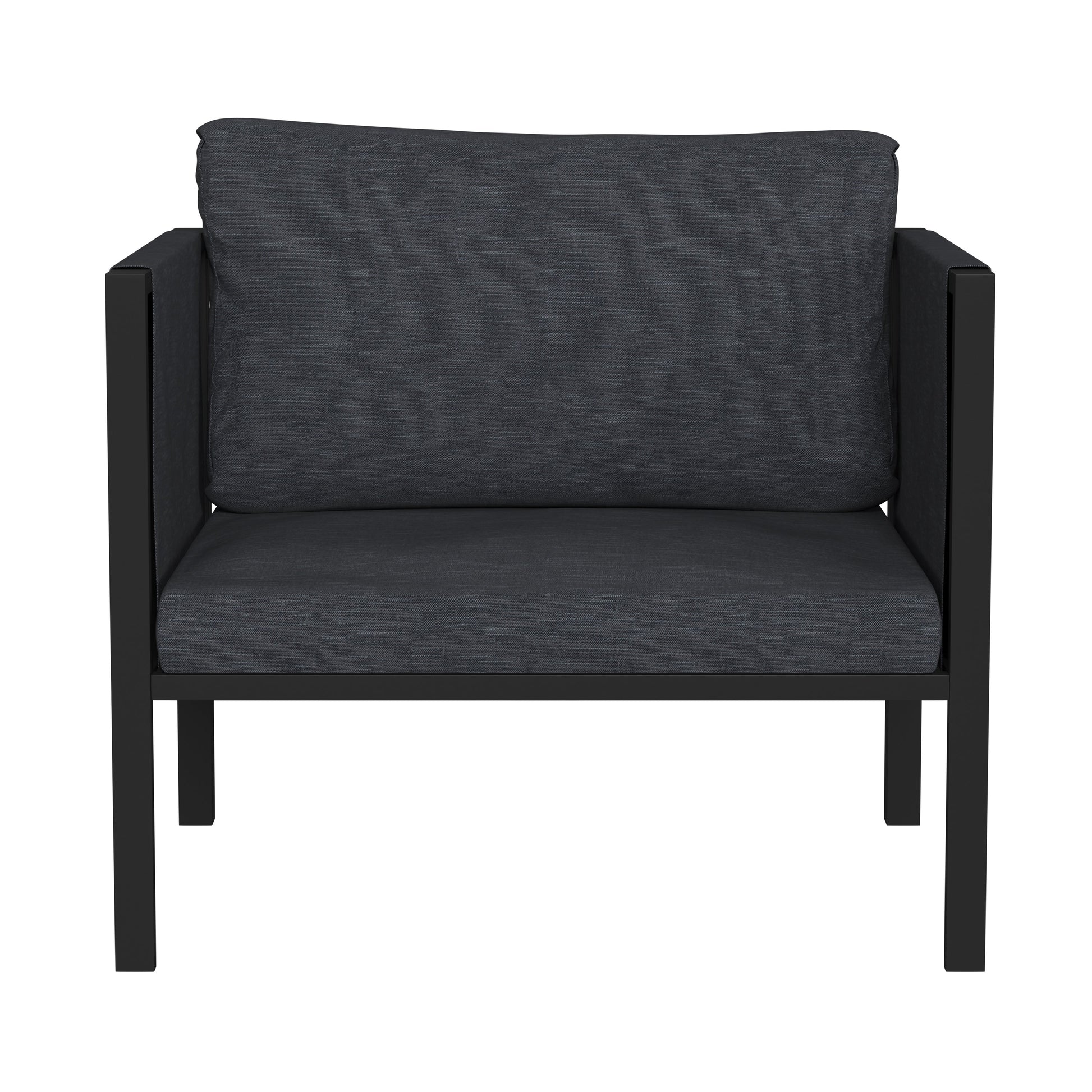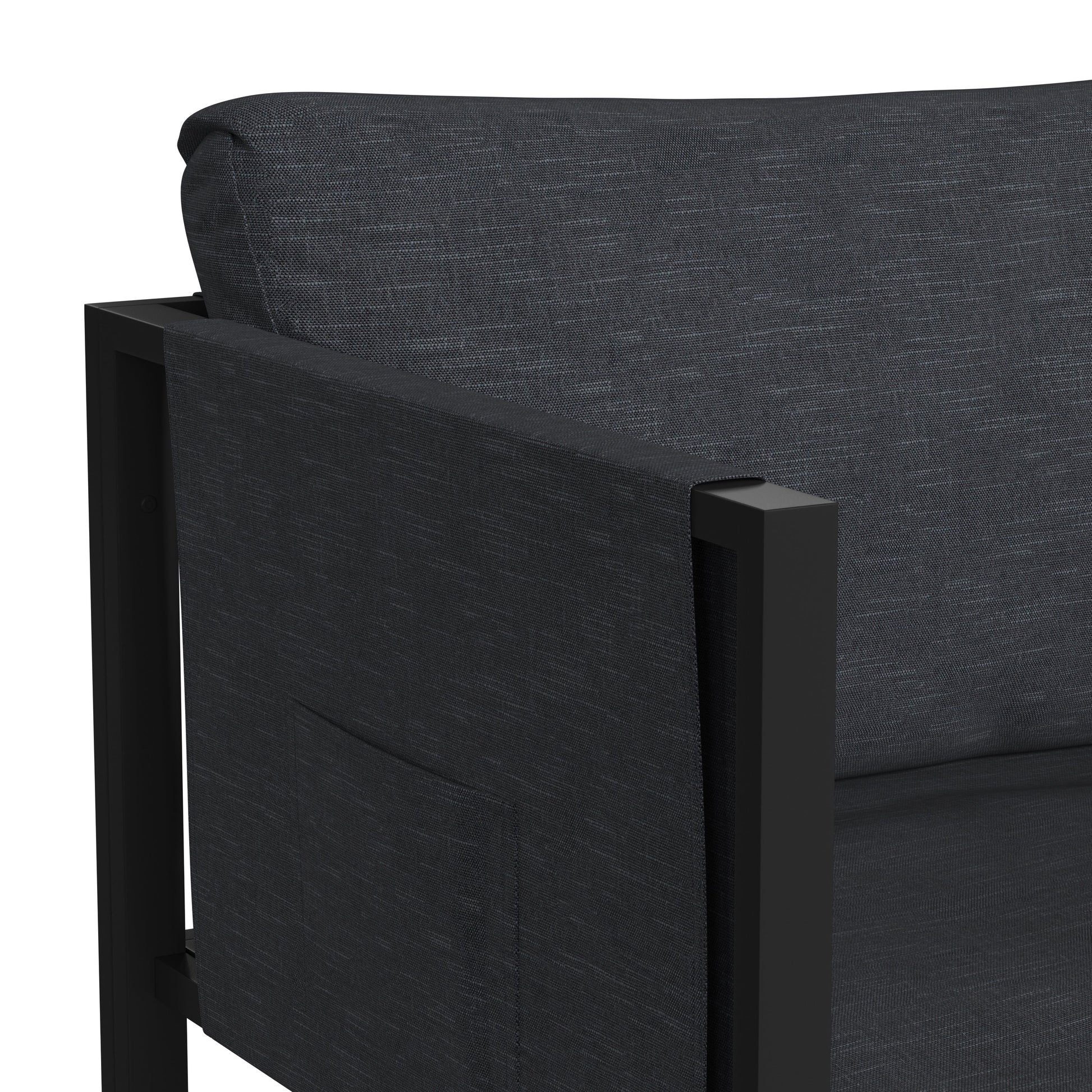 Lea Indoor/Outdoor Patio Chair with Cushions - Modern Steel Framed Chair with Storage Pockets, Black with Charcoal Cushions Dimensions: 33"W x 28.75"D x 26.5"H