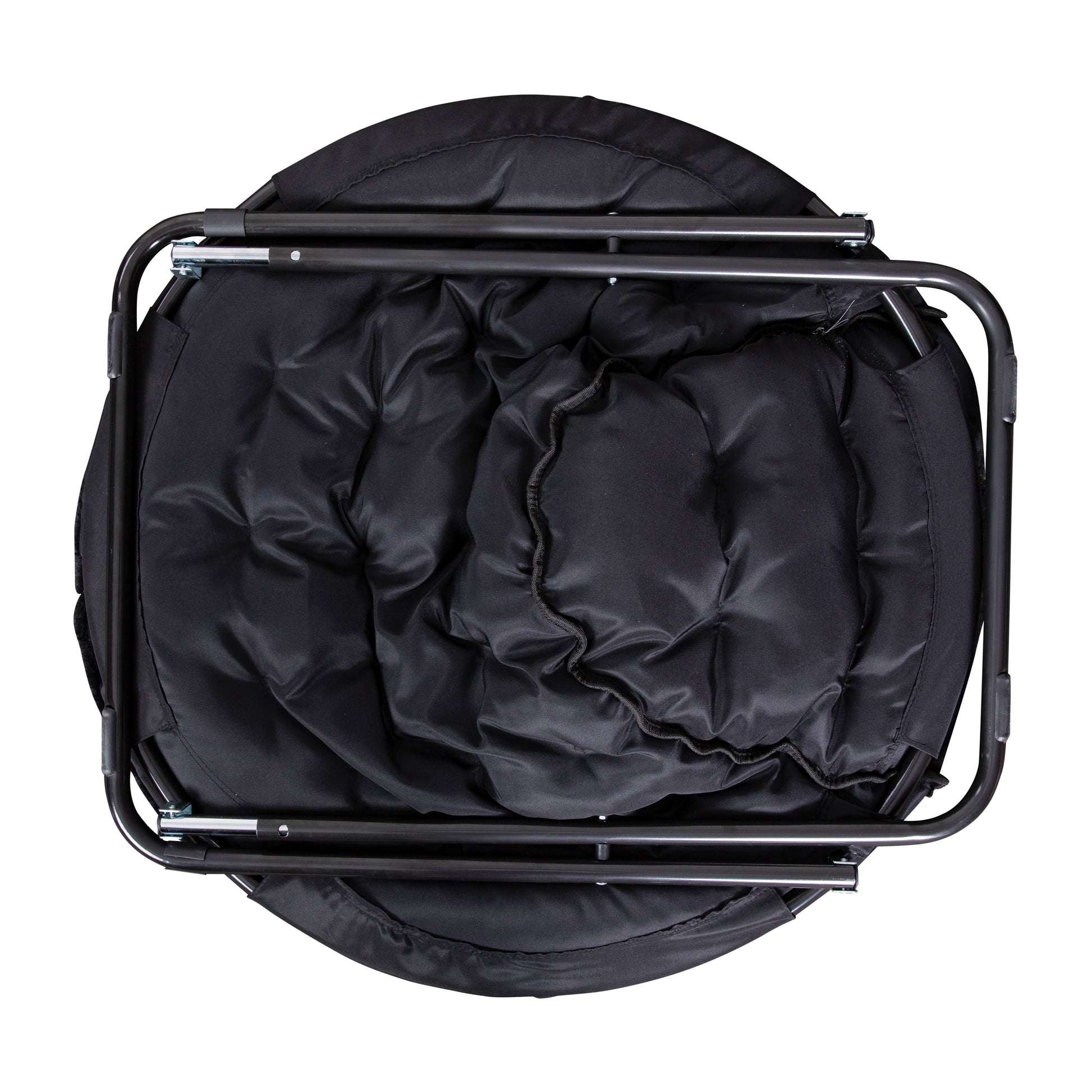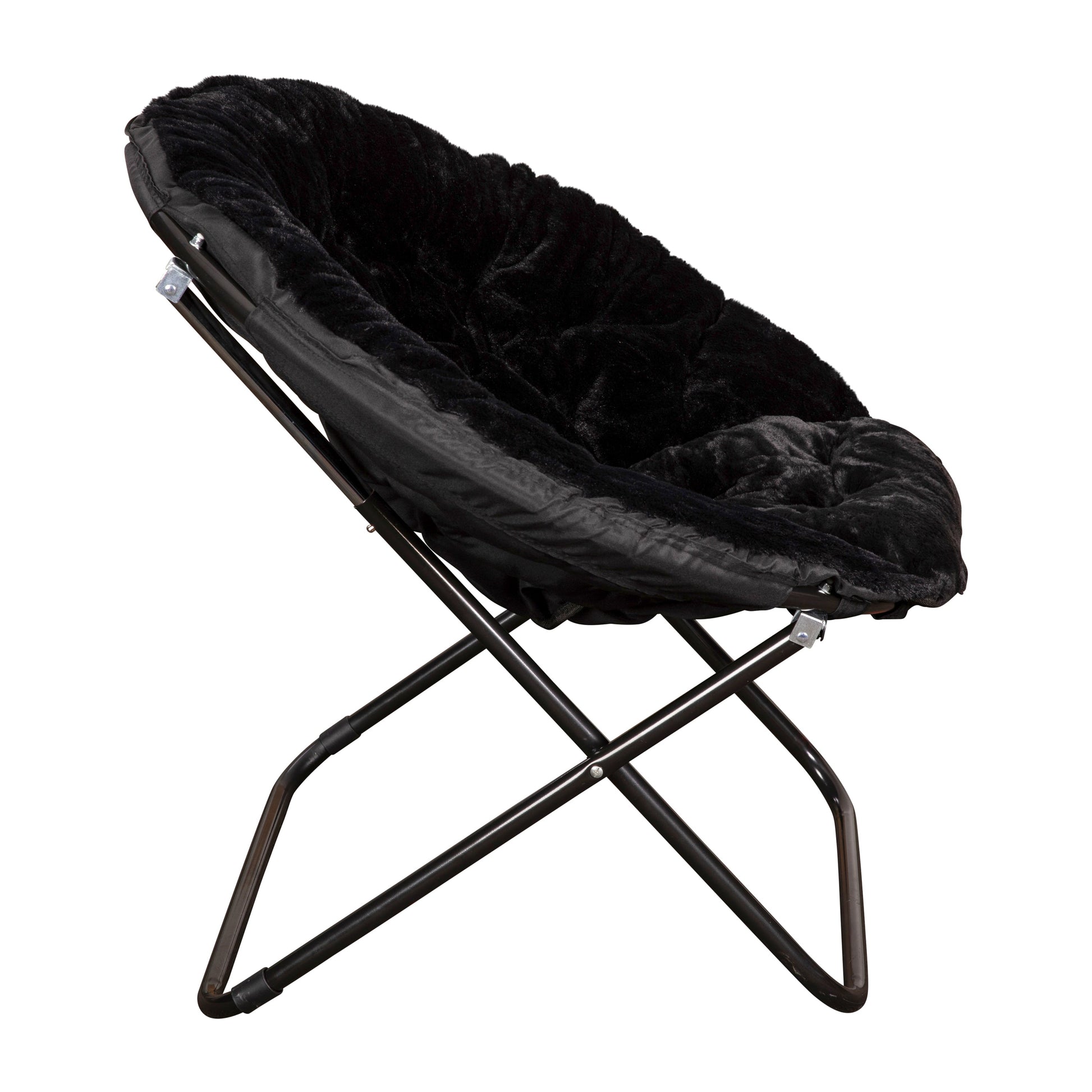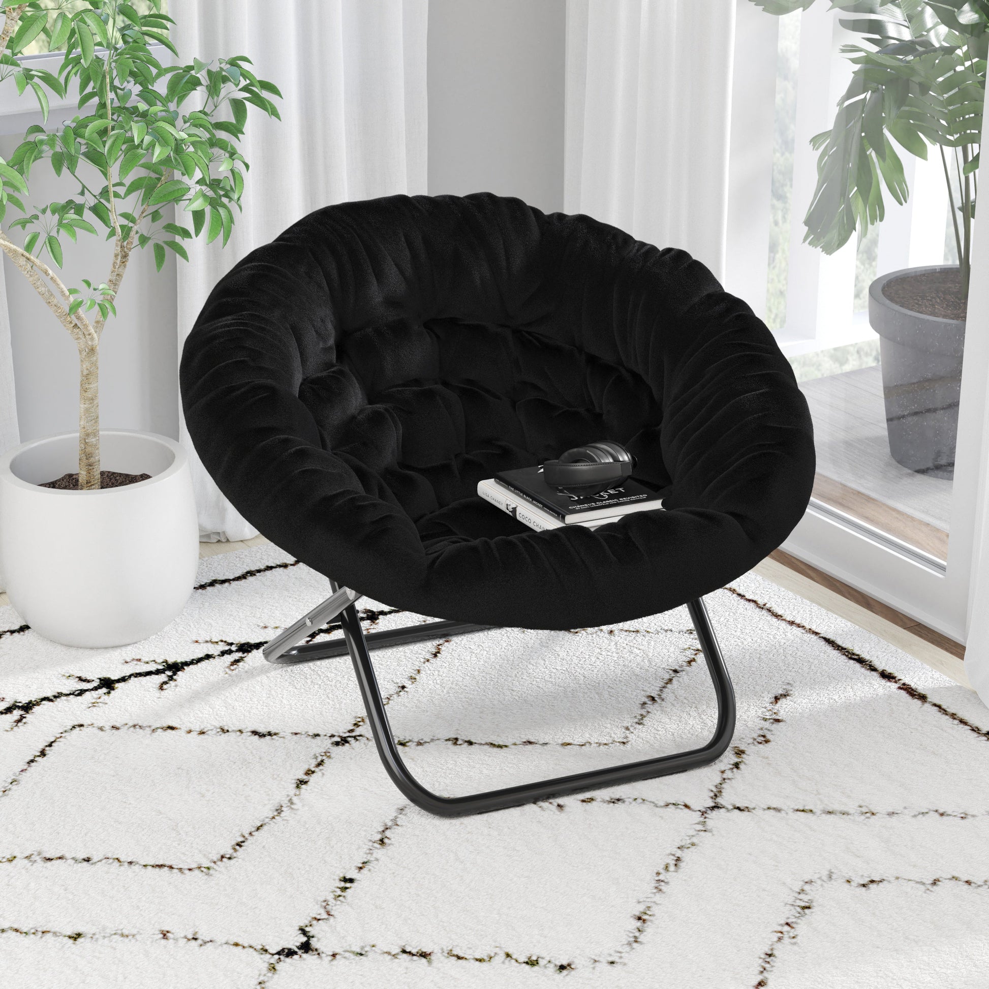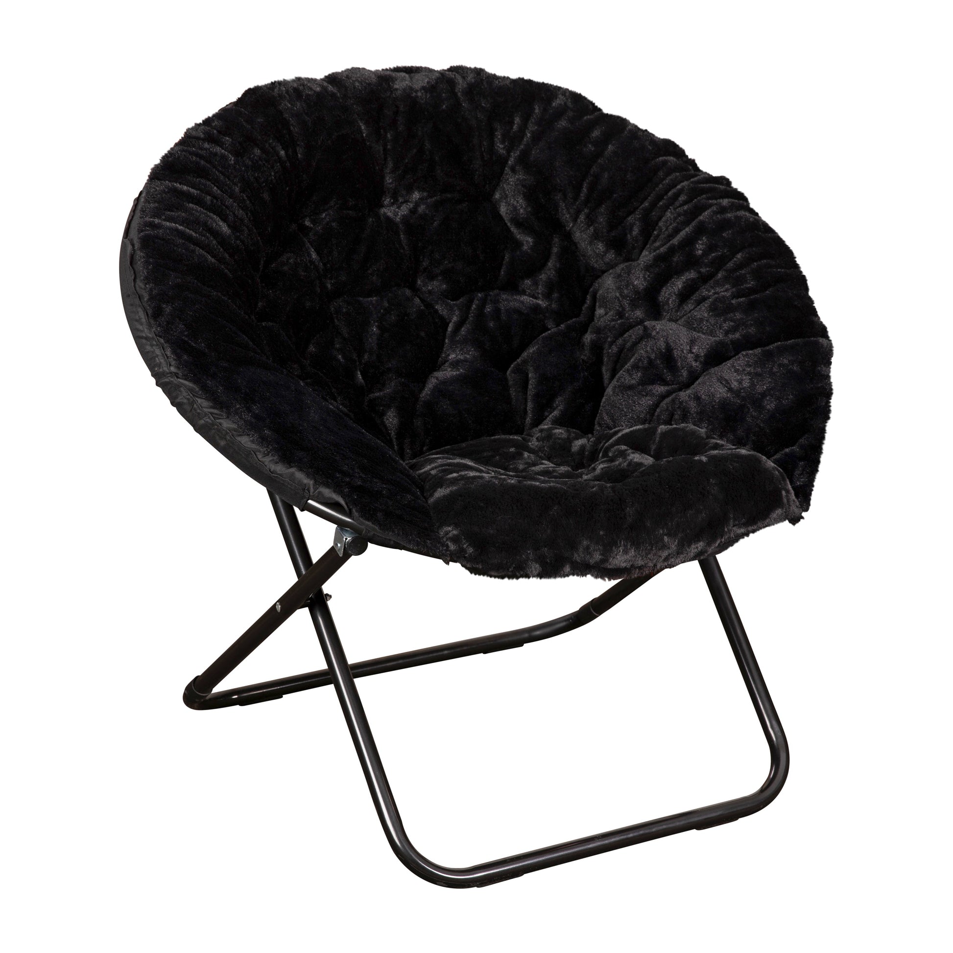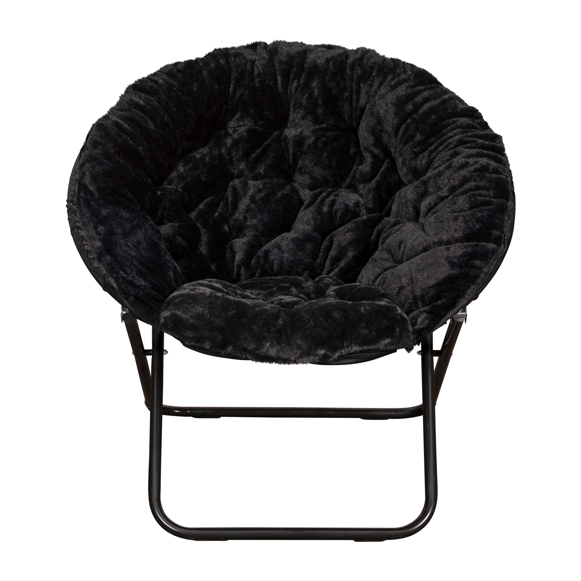 Gwen 38" Oversize Portable Faux Fur Folding Saucer Moon Chair for Dorm and Bedroom, Black Faux Fur/Black Frame Dimensions: 35.75"W x 31"D x 33.5"H
