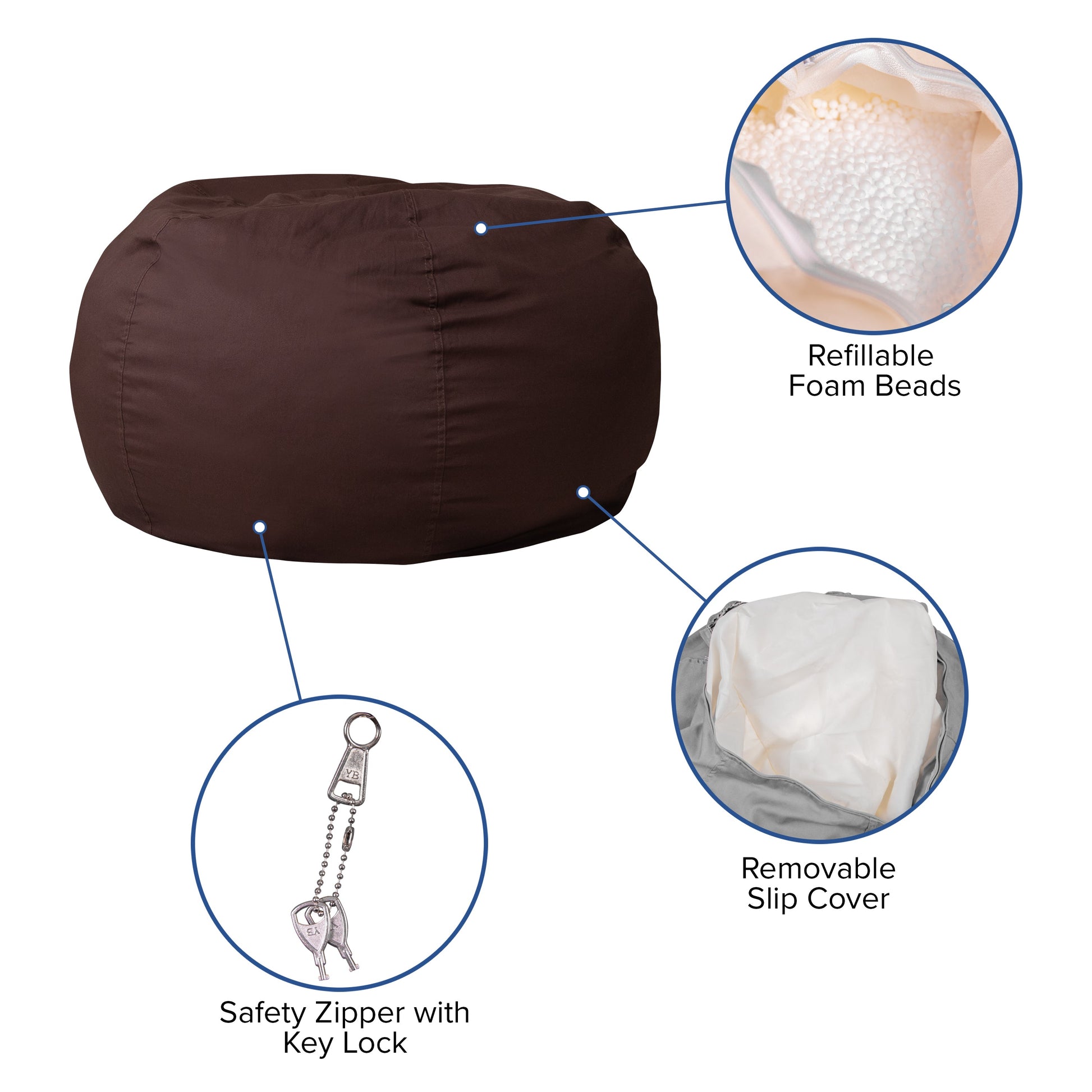 Duncan Oversized Solid Brown Refillable Bean Bag Chair for All Ages Dimensions: 42"W x 42"D x 19"H