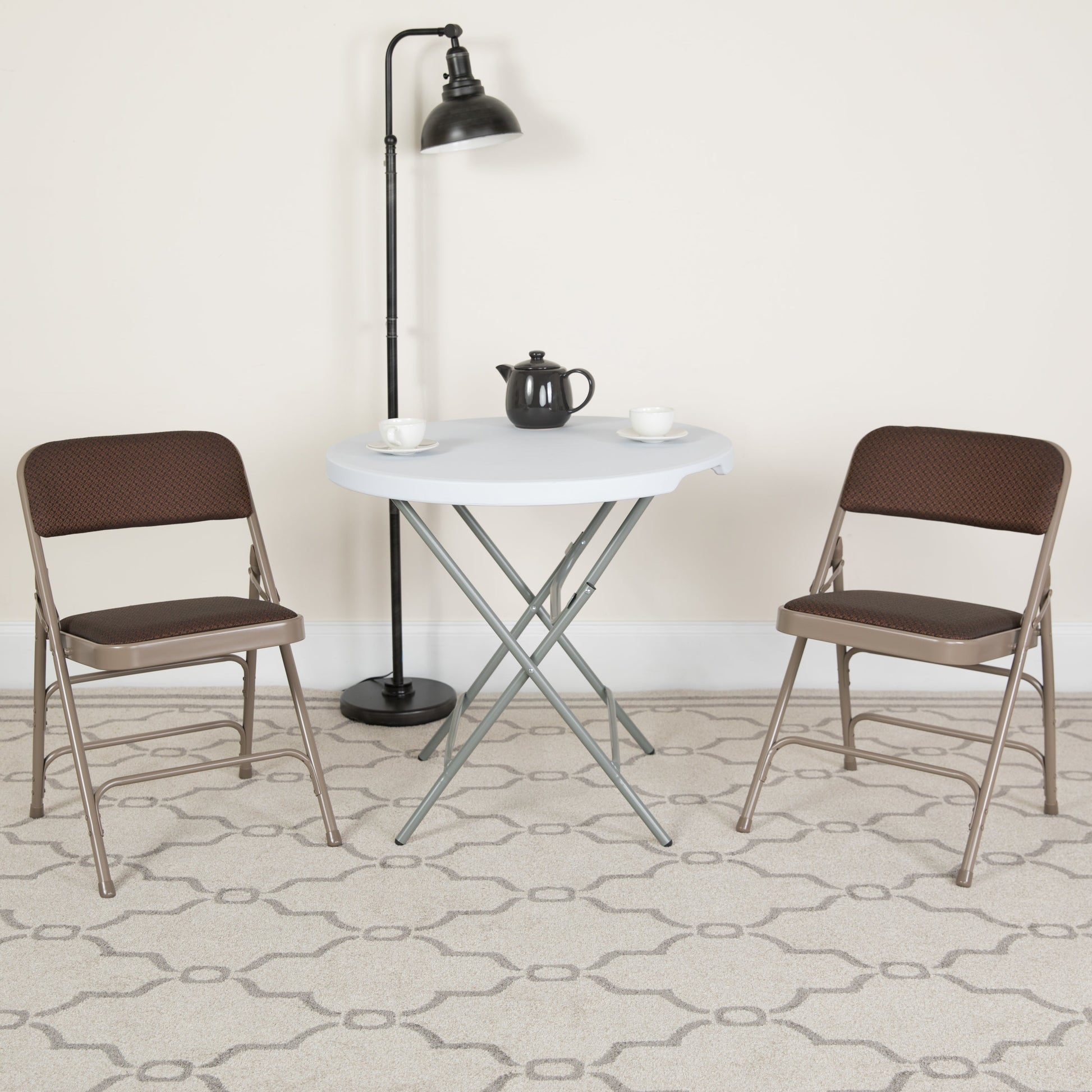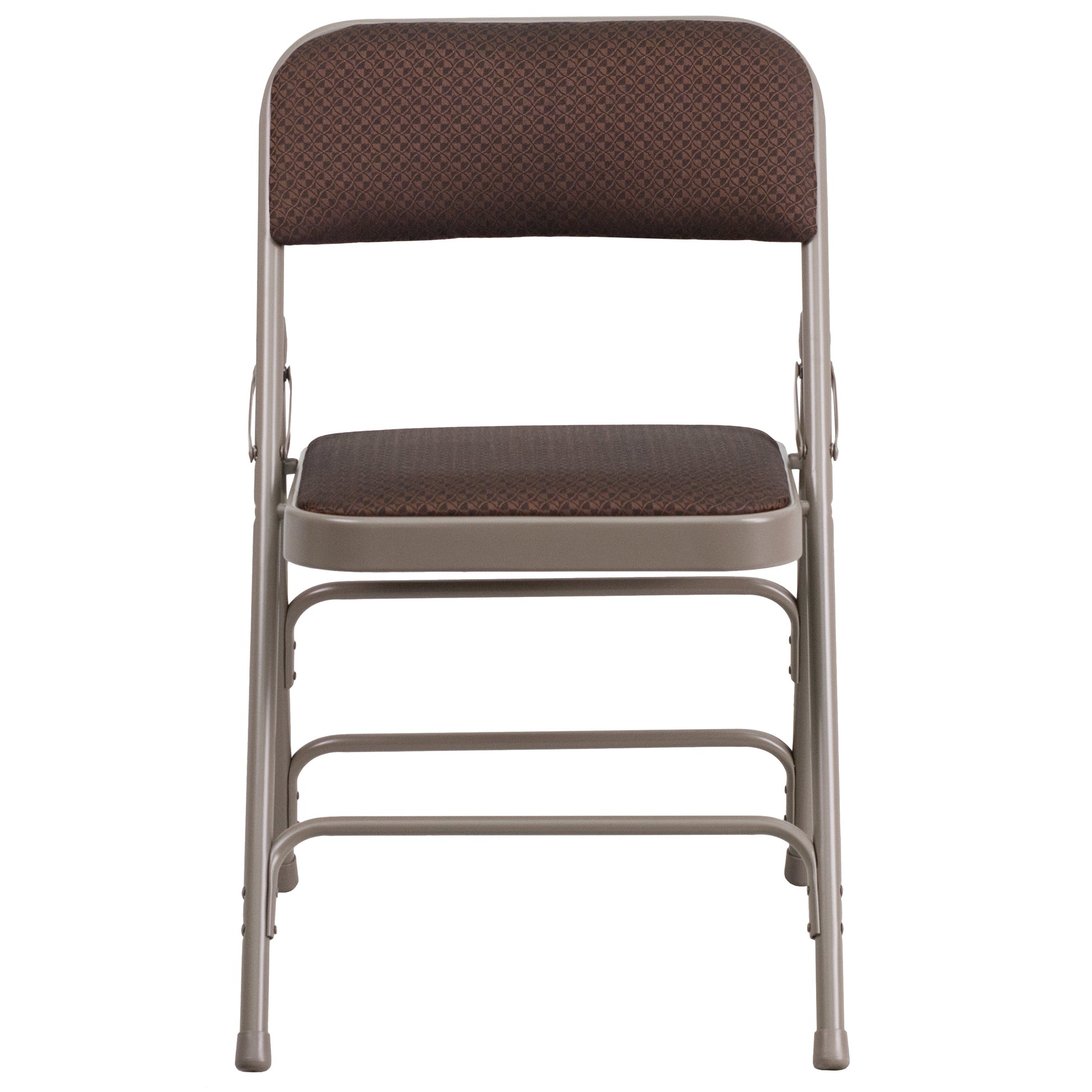 2 Pack HERCULES Series Curved Triple Braced & Double Hinged Brown Patterned Fabric Metal Folding Chair Dimensions: 18.75"W x 18"D x 30"H