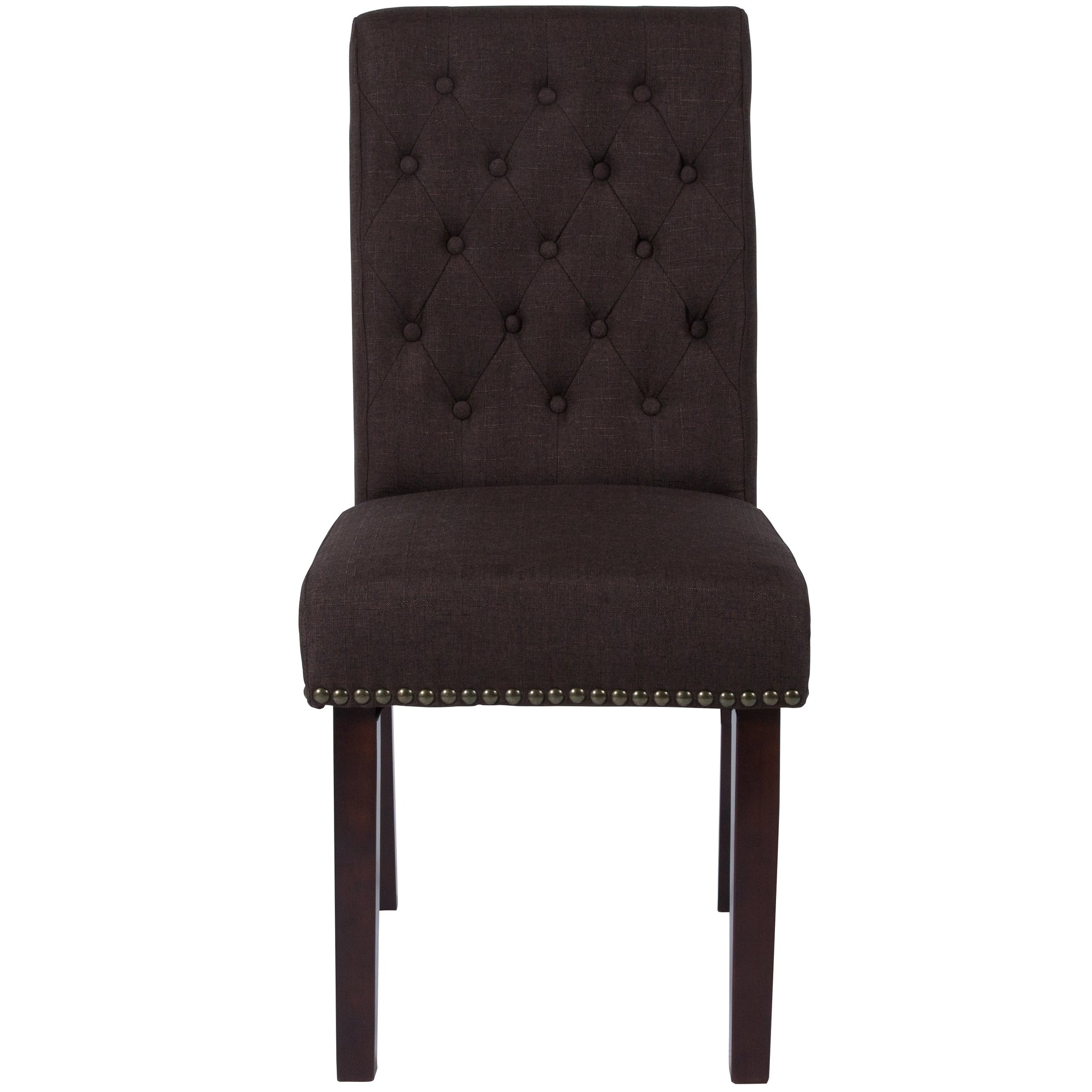 HERCULES Series Brown Fabric Parsons Chair with Rolled Back, Accent Nail Trim and Walnut Finish Dimensions: 18.5"W x 27.5"D x 39.75"H