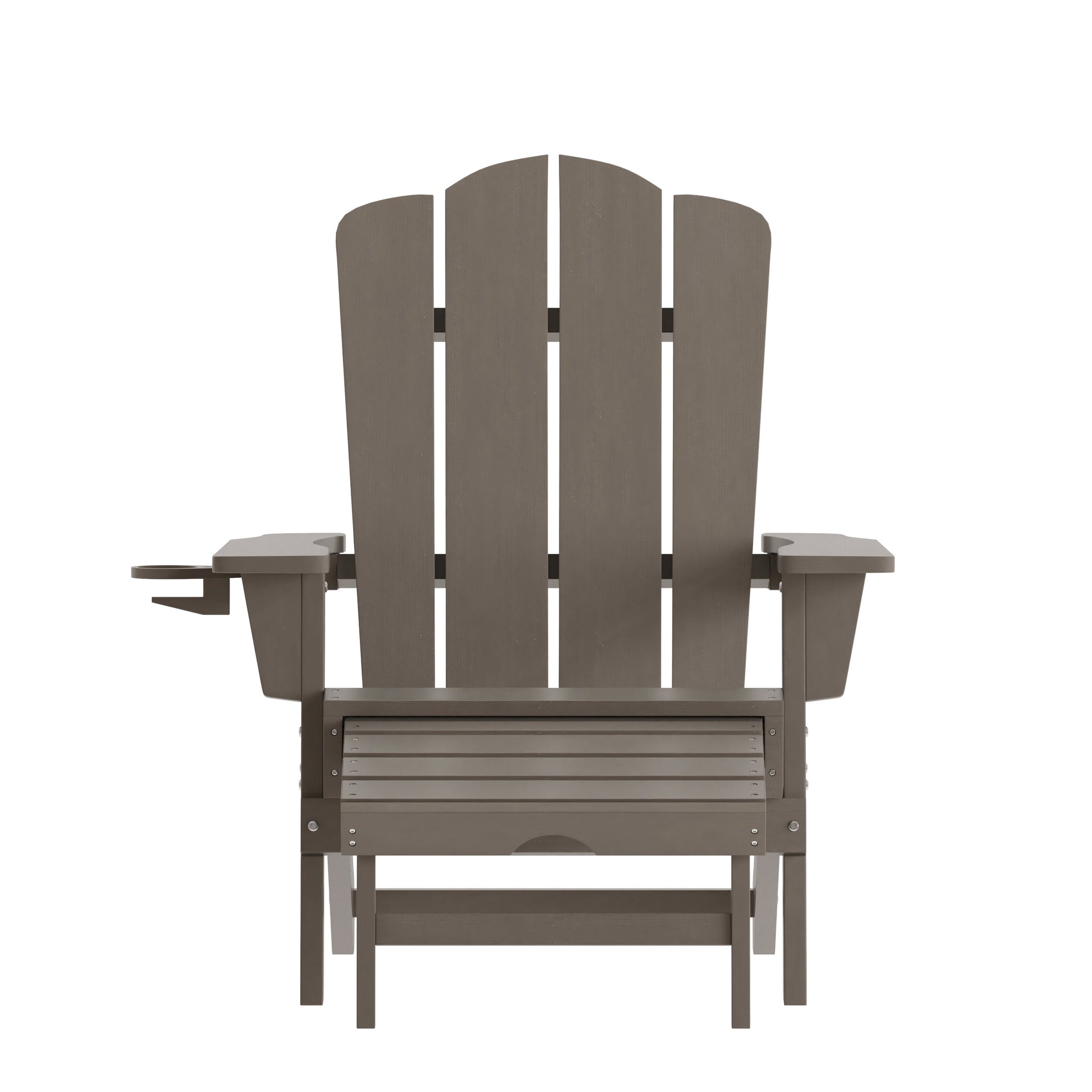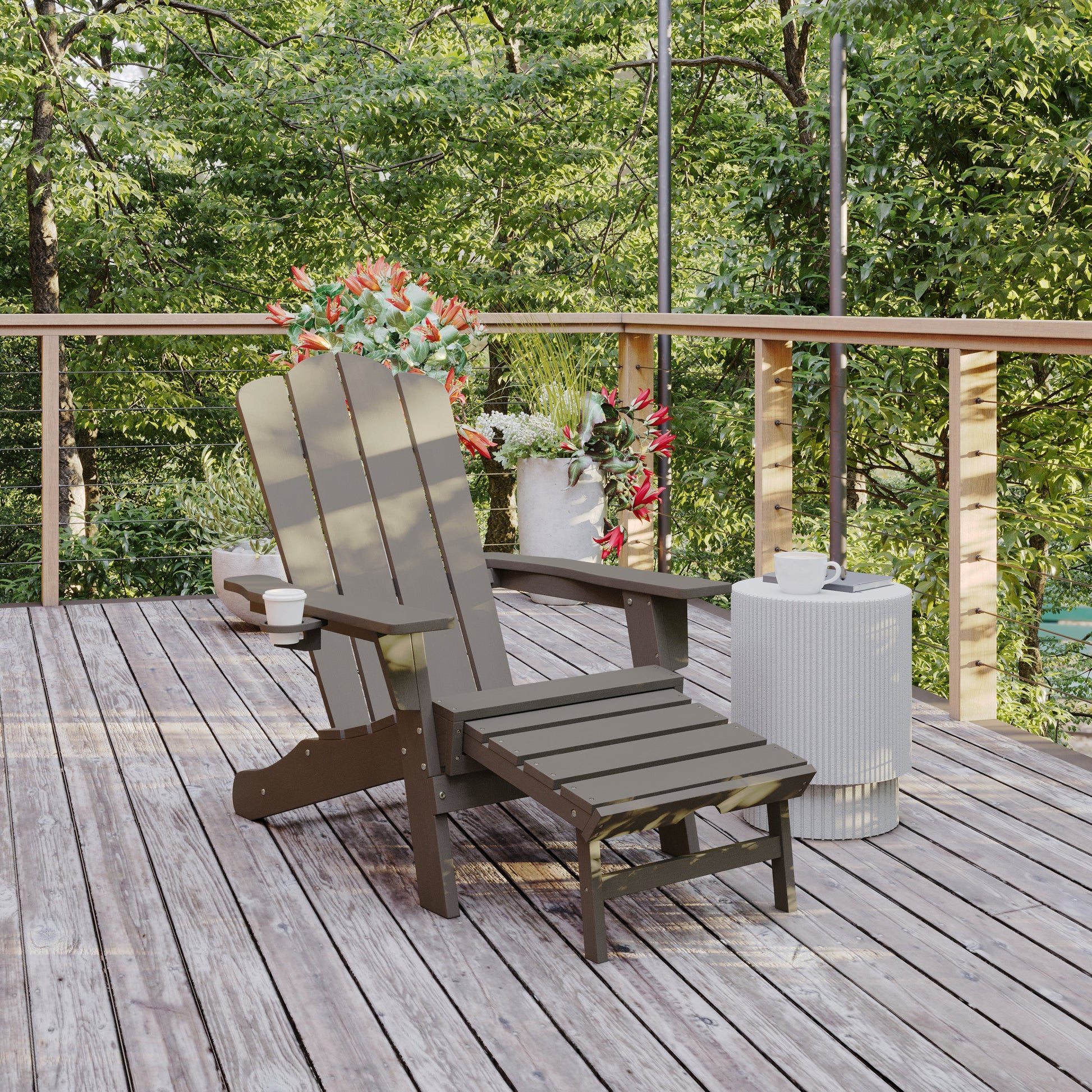 Newport HDPE Adirondack Chair with Cup Holder and Pull Out Ottoman, All-Weather HDPE Indoor/Outdoor Lounge Chair in Brown Dimensions: 33.75"W x 33.25" - 47.25"D x 35.75"H