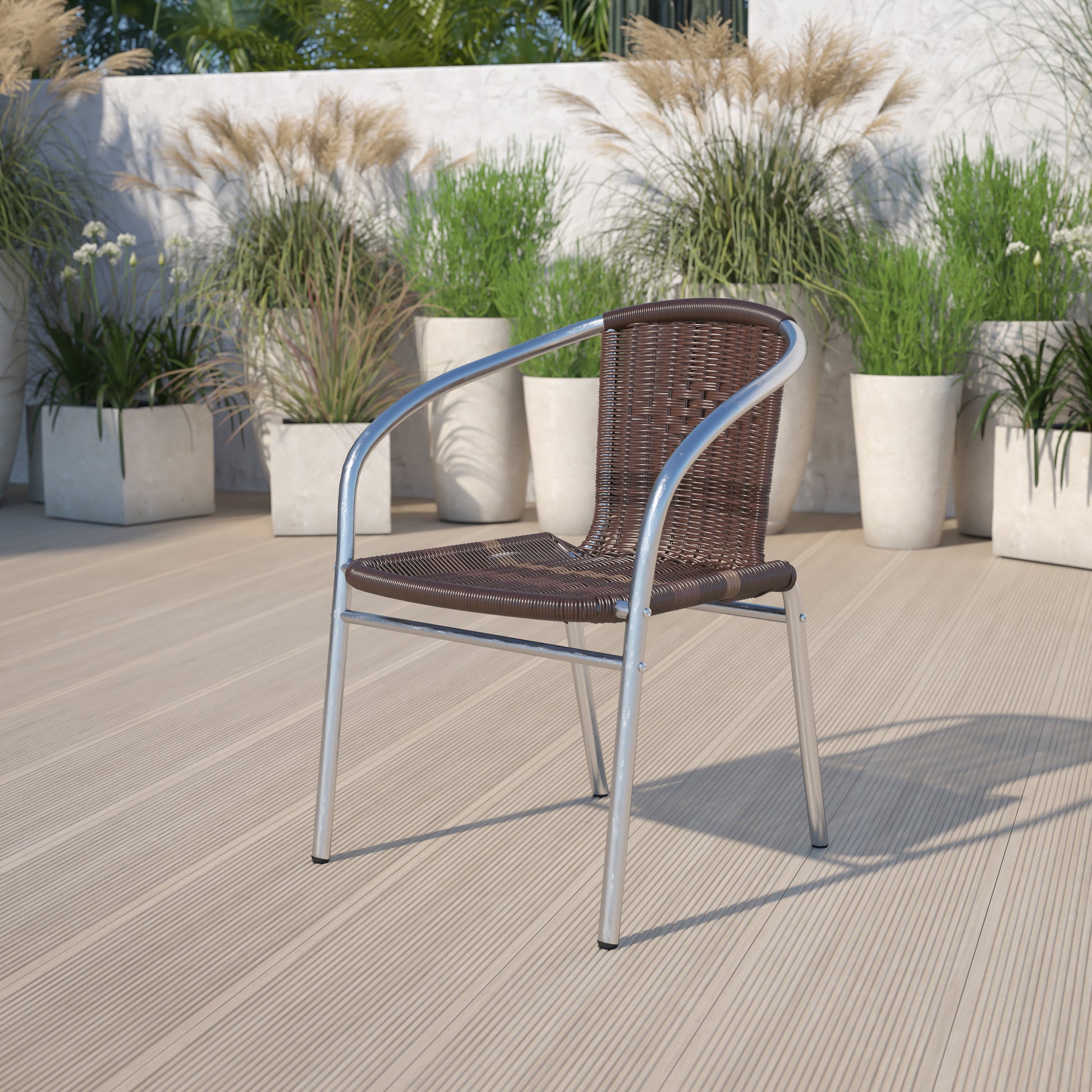 Lila Commercial Aluminum and Dark Brown Rattan Indoor-Outdoor Restaurant Stack Chair Dimensions: 21.75"W x 22"D x 29"H