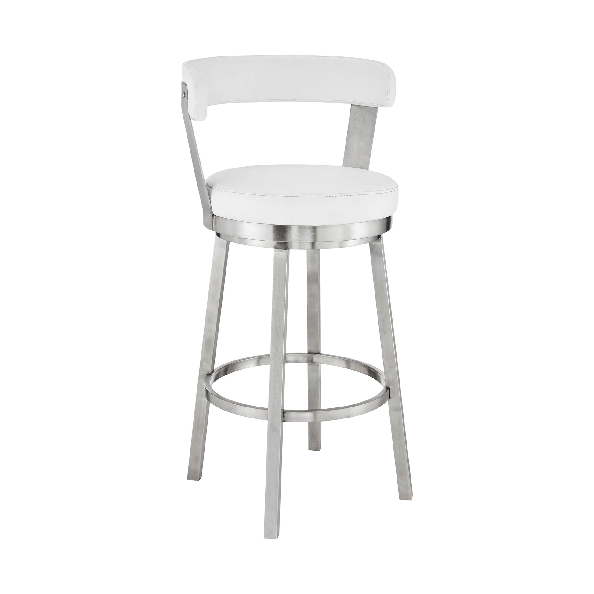 Elevate your seating experience with the Bryant Swivel Bar Stool from Armen Living, a perfect blend of modern style and exceptional comfort. This innovative metal stool features sleek faux leather upholstery paired with strong metal accents, making it an ideal addition to any contemporary kitchen or dining area. The plush, thick foam-padded cushion ensures that you and your guests can relax in comfort for extended periods, whether you're enjoying a casual meal or entertaining friends.