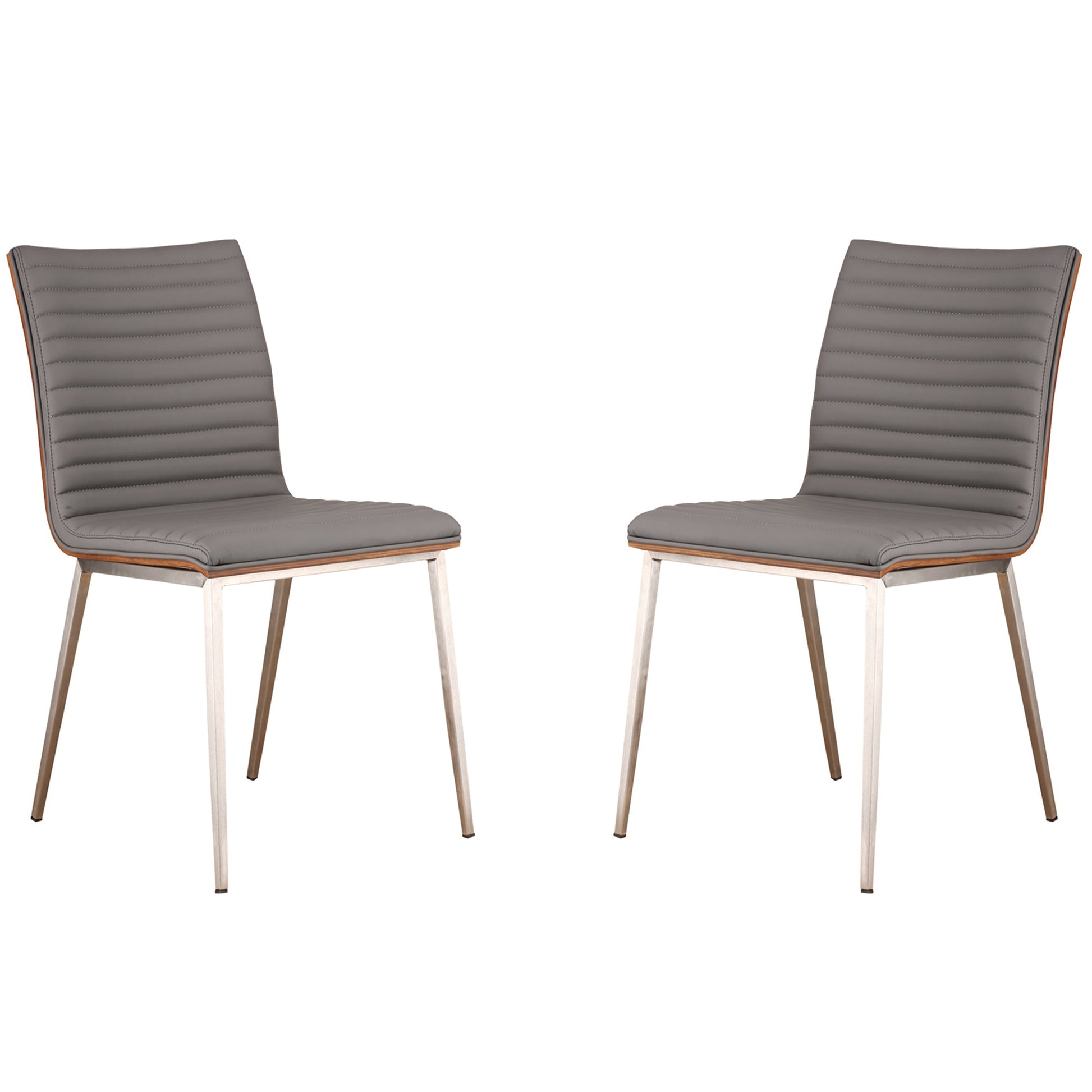 Café Brushed Stainless Steel Dining Chair in Gray Faux Leather with Walnut Back - Set of 2