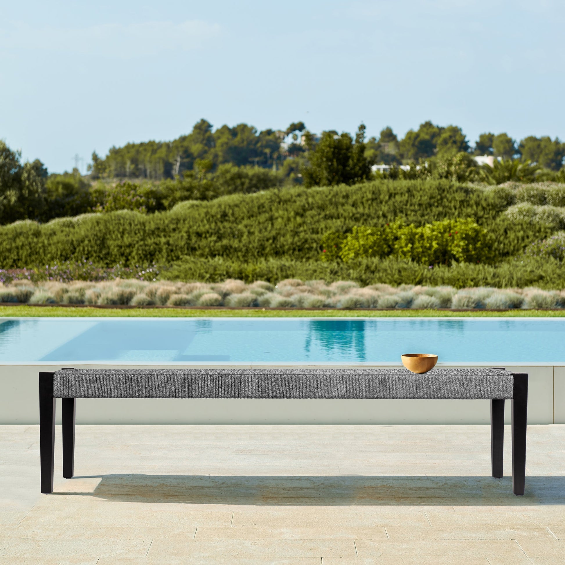 Camino Indoor Outdoor Dining Bench in Eucalyptus Wood and Gray Rope