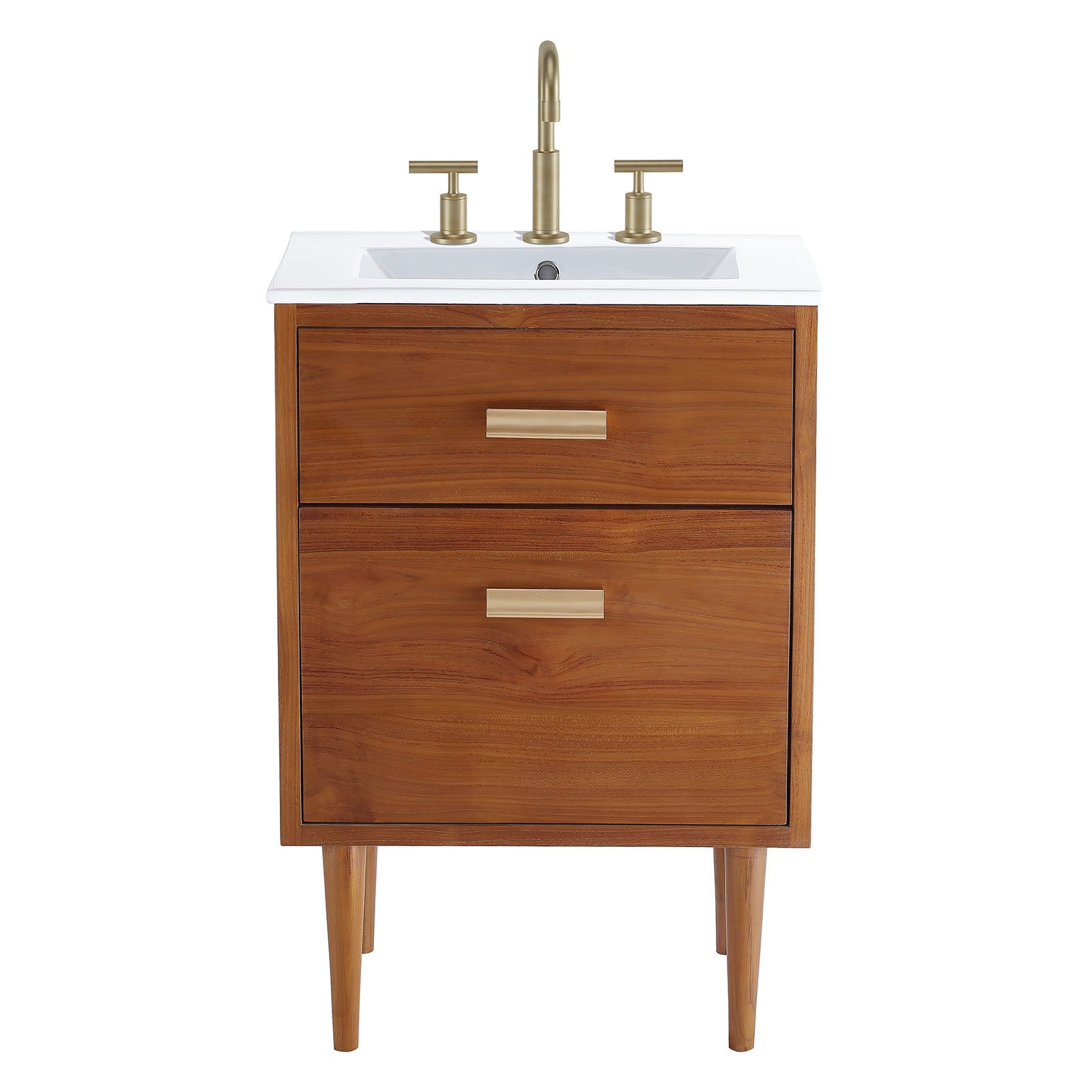 Transform your bathroom into a stylish retreat with this mid-century inspired vanity, designed to bring organic tropical aesthetics into your space. Crafted from solid teak wood, this vanity features a clean-lined design complemented by brass metal hardware and a faux front door for added visual interest. Raised on retro tapered legs, it combines durability with modern charm, making it a perfect fit for contemporary bathrooms.