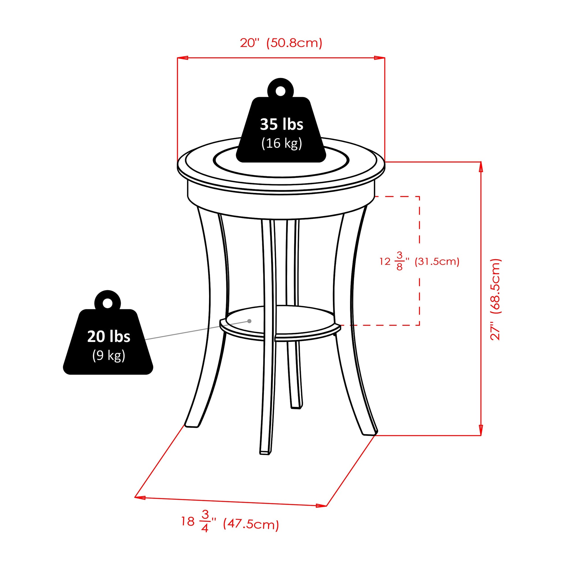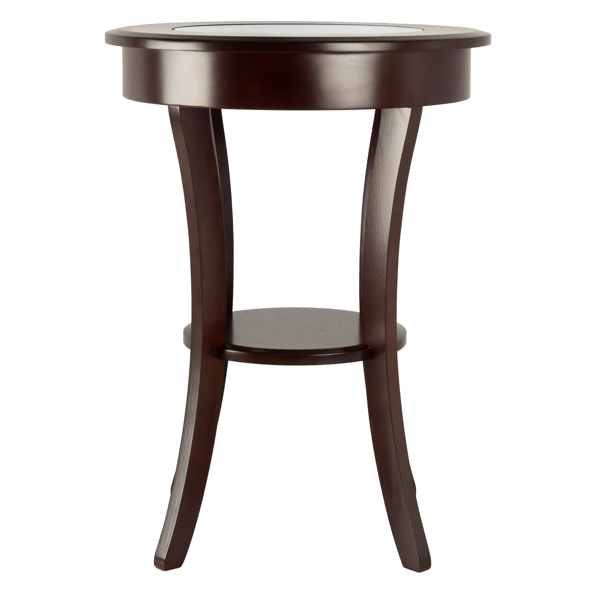 The Cassie round wood accent table will elegantly style any room and is perfect for a lamp, floral, or photo display with its 20" table top. A 12.9" tempered glass piece sits in the center of the top and combined with It's curved legs gives transitional feel that can blend with many styles. The overall size of the table is 20"W x 20"D x 27"H and is finished in a rich cappuccino color and made of solid and composite wood. Assembly required.Dimensions : 20 in. Wide 20 in. Deep 27 in. High