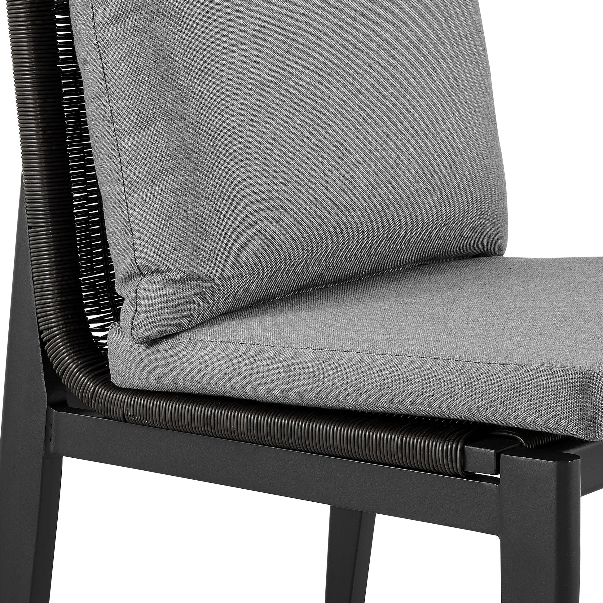 Bring modern elegance to your outdoor space with the Cayman outdoor dining chairs – set of 2 from Armen Living. Featuring a gracefully curved hand-woven rattan back, the outdoor chairs vouch for a sleek and inviting design while offering ergonomic properties to keep your back properly aligned. These metal and wicker patio furniture pieces include plush dark gray high-density foam cushions to offer a wonderfully comfortable sitting experience. The cushions feature a zipper closure that allows for easy removal and cleaning, making these a convenient outdoor furniture addition! It vouches for a breezy and comfortable look, allowing you to dine in and relax outdoors. Made up of lightweight and durable aluminum framework, the Cayman dining chairs are the ideal piece of outdoor patio furniture. They are easily portable and feature a multi-layer powder coating for further effective protection from the elements and everyday wear and tear. This is a perfect piece to use indoors and is treated to withstand being outdoors. Without having to worry about UV, rust, or weather damage, the Cayman outdoor patio dining chairs are ideal for your home, regardless of your location. The armless design is convenient and allows you to move your seat as close as needed to any surface. The Cayman outdoor chairs with cushions are sold as a set of 2 and feature a beautiful black powder coat finish and dark gray cushions. With a 19-inch seat height, the Cayman chairs can support up to 308lbs per seat.