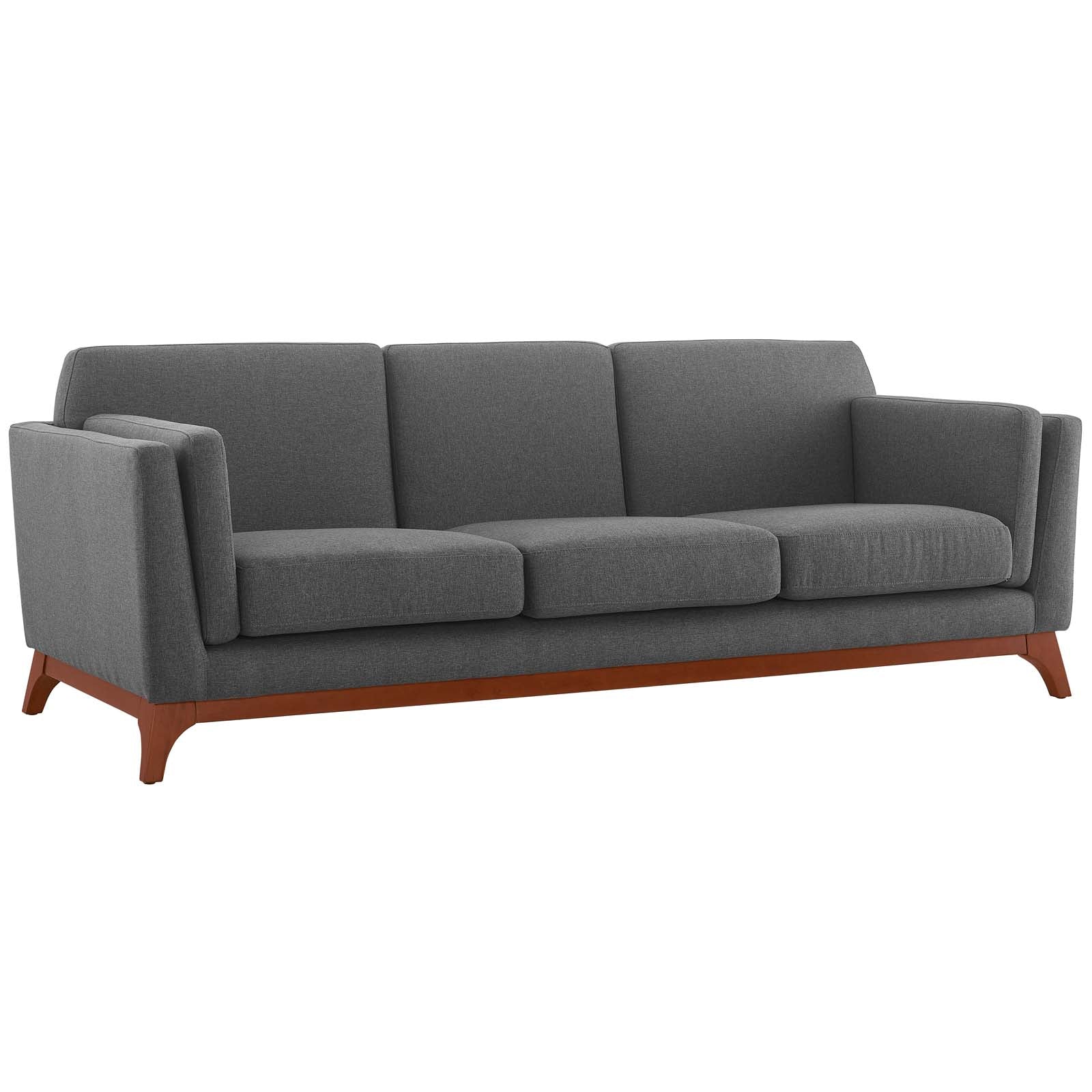 Distill organic mid-century charm with Chance Upholstered Fabric Sofa. Clean lines and flared arms add intrigue to the elegant silhouette, as the broad, oversized profile offers up a comfortable place to rest and relax. Finely upholstered in soft polyester fabric, Chance features plush, dense foam padding, removable cushions for easy cleaning with machine-washable cushion covers, a solid wood frame with tapered legs, and plastic non-marking foot caps. Update your living room, lounge area, apartment or small living space with this low profile contemporary couch perfect for all casual seating needs. Sofa Weight Capacity: 1323 lbs.