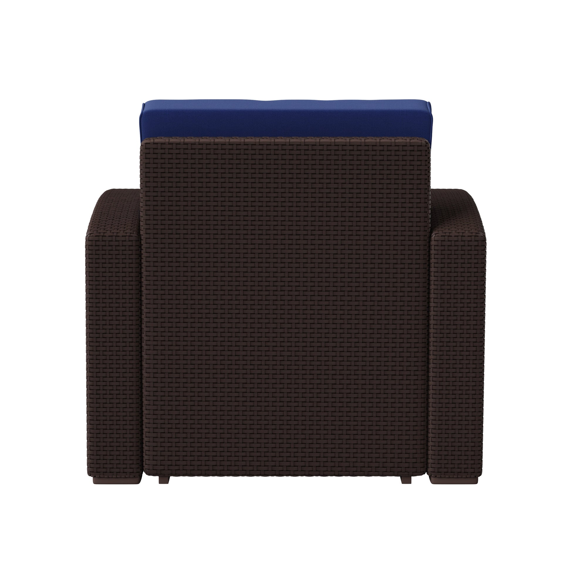 Seneca Brown Faux Rattan Chair with All-Weather Navy Cushion Dimensions: 32.75"W x 28"D x 32"H