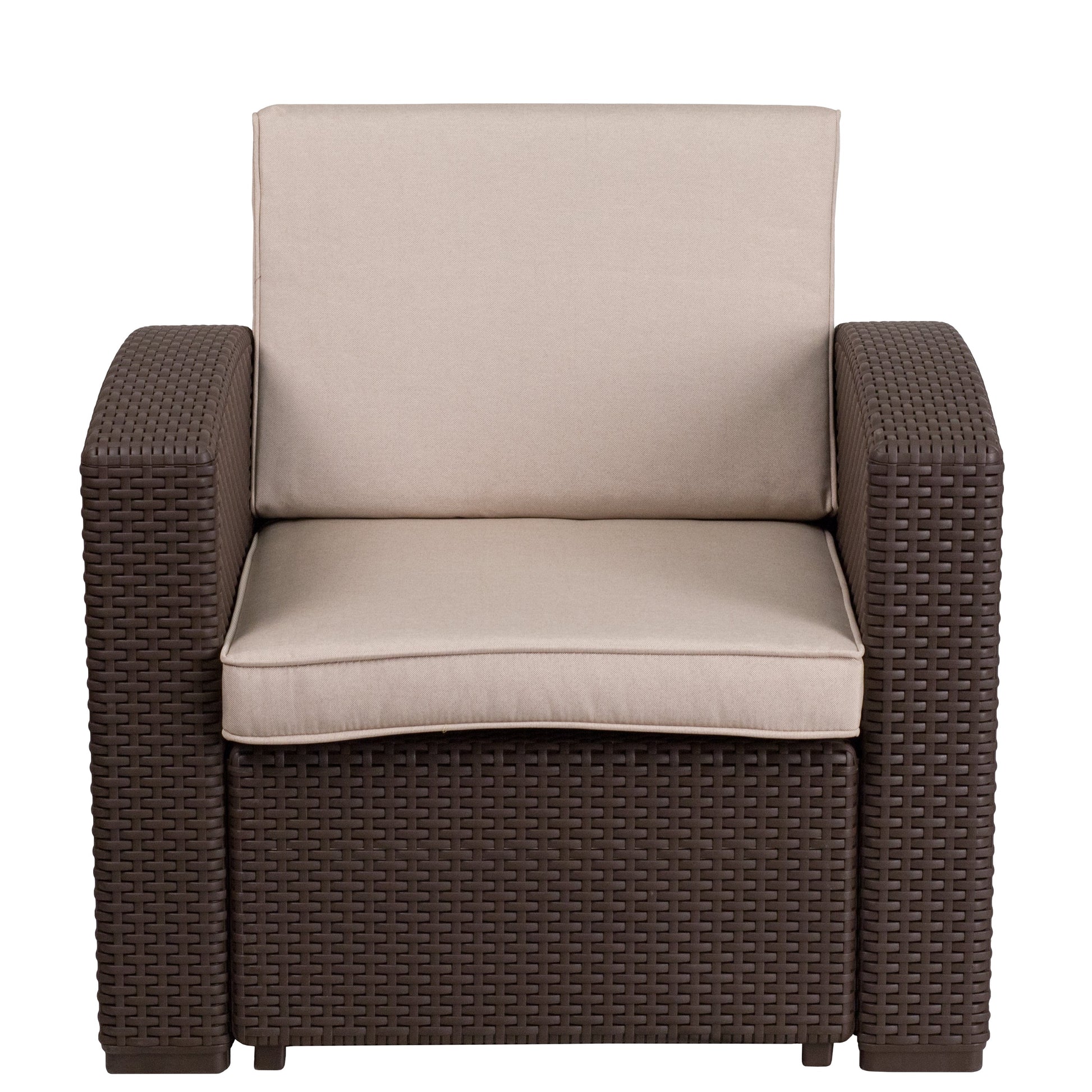 Seneca Chocolate Brown Faux Rattan Chair with All-Weather Beige Cushion Dimensions: 32.75"W x 28"D x 32"H