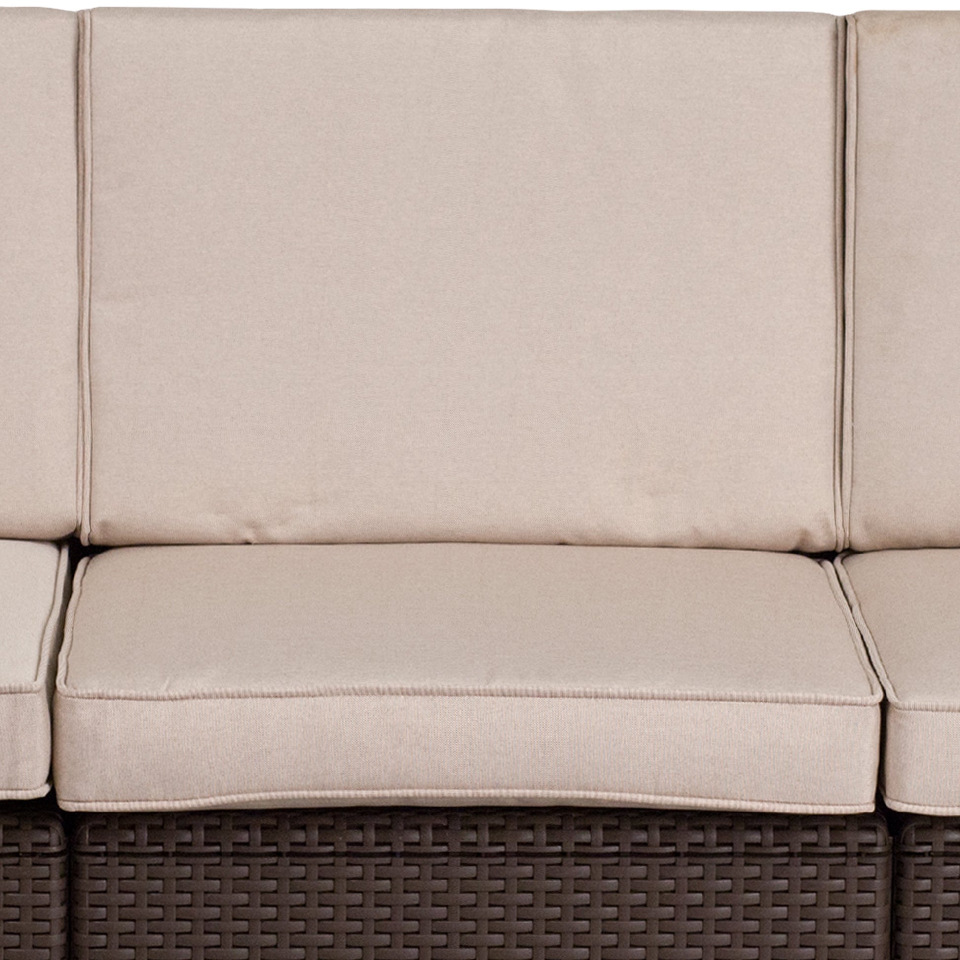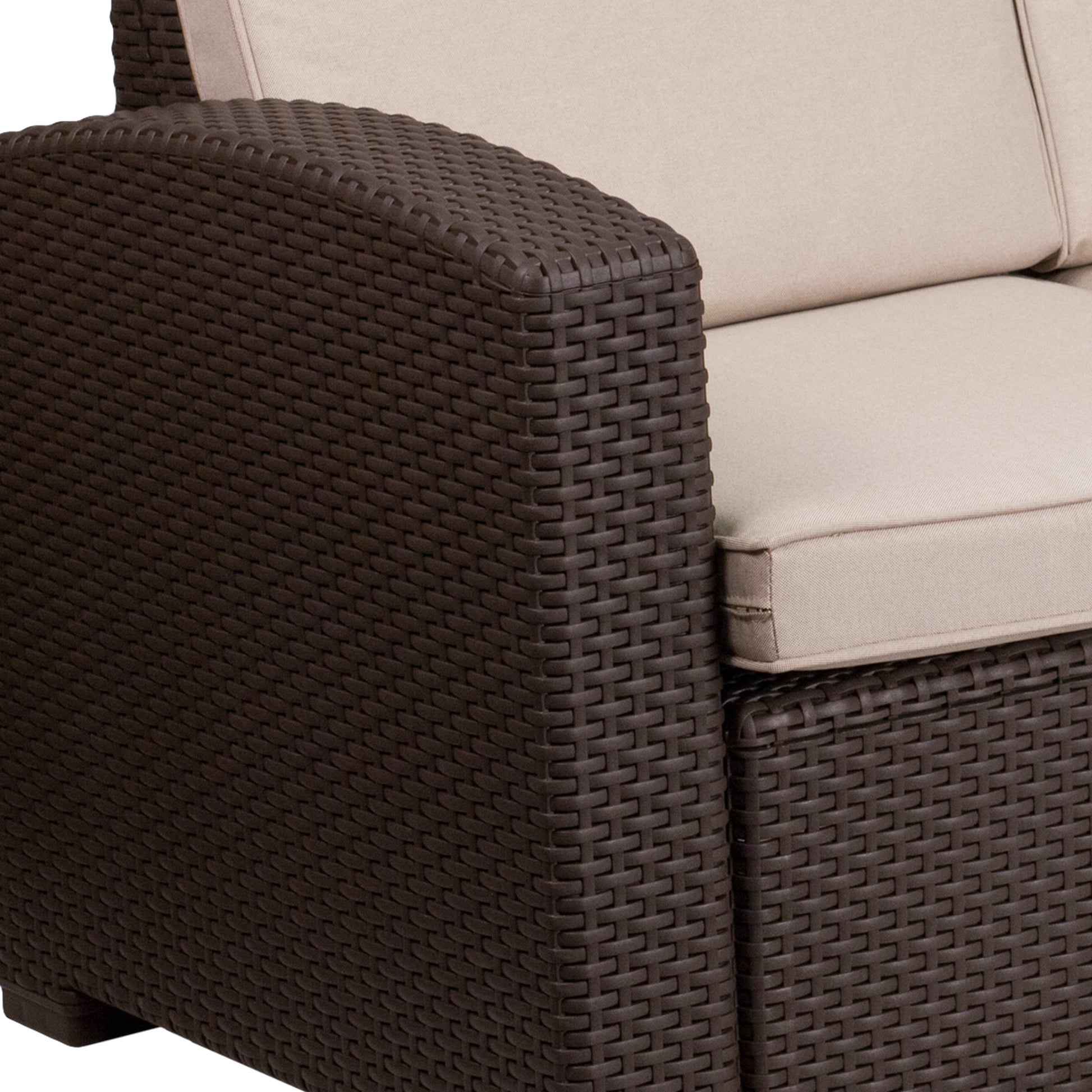 Seneca Chocolate Brown Faux Rattan Sofa with All-Weather Beige Cushions Dimensions: 78.5"W x 28"D x 32"H