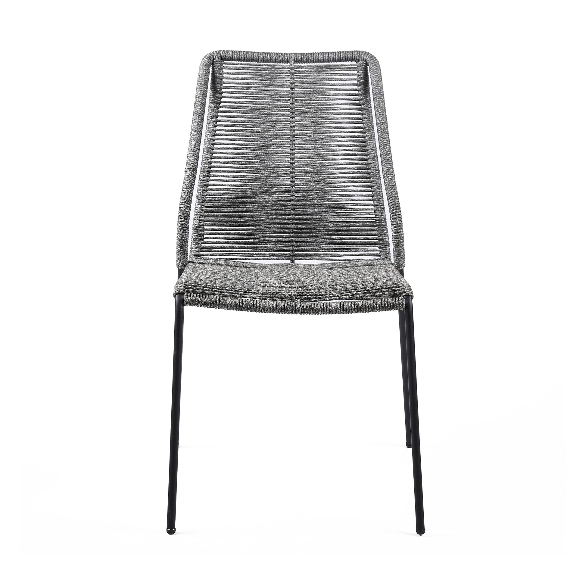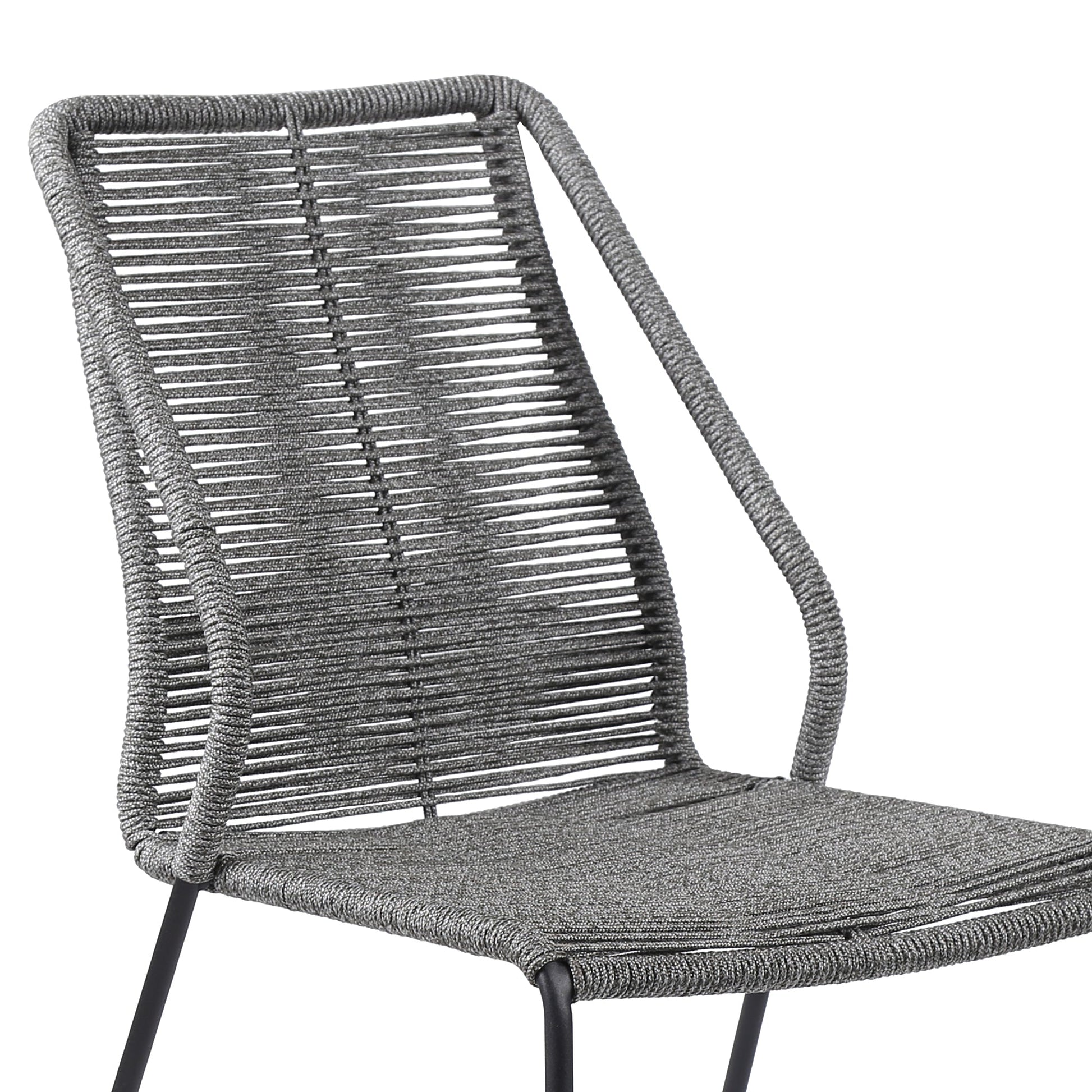 The Clip Indoor Outdoor Steel Dining Chair with Gray Rope - Set of 2 from Armen Living are the epitome of comfort and dependability. The Clip outdoor dining chairs come in a set of two - perfect for mixing and matching to create your ideal preferred outdoor atmosphere. The intricately woven rope featured on the durable metal frame form to offer you extreme comfort and relaxation. This outdoor chair is wrapped in resilient regatta rope cording, providing supple support while still allowing for element passthrough. - also enhancing your seating experience with a softness that rivals most fabrics. Each chair is made with the best craftsmanship, with these chairs standing on top of durable metal legs in a black finish for a modern look. For use indoors and out, the soft UV coated nylon cords are hand dyed resulting in subtle tonal variations. This classic midcentury chair, with a black powder-coated steel frame is available in your color choice of black, brick red, gray, or blue - choose your favorite to match your outdoor decor. The Clip chairs are sold as a pair and are stackable. Product Dimensions: 22"W x 25"D x 35"H SH: 18.6"
