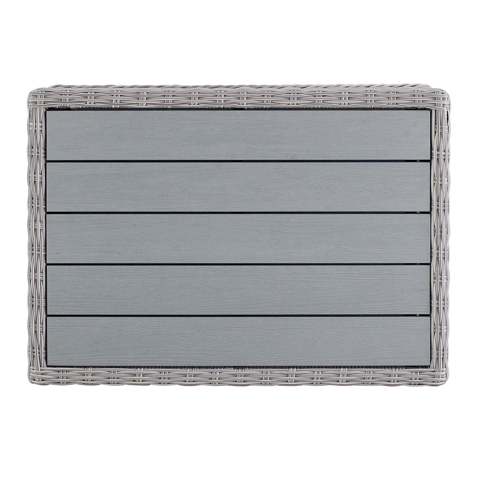 Enjoy fresh air and alfresco relaxation with the Conway Outdoor Patio Wicker Rattan Coffee Table. Wrapped in UV-resistant light gray synthetic wicker rattan, this patio table boasts organic texture and a neutral hue that brings a calming presence to your outdoor space. The frame of this outdoor coffee table is crafted with durable powder-coated aluminum and rests on L-shaped legs with plastic foot glides. A planked tabletop that replicates the texture of wood offers the perfect place to rest a drink or plate while entertaining. Trending aesthetics and a classic design define this outdoor patio furniture collection making it a beautiful addition to any outdoor space including the backyard, patio, porch, balcony, or poolside.