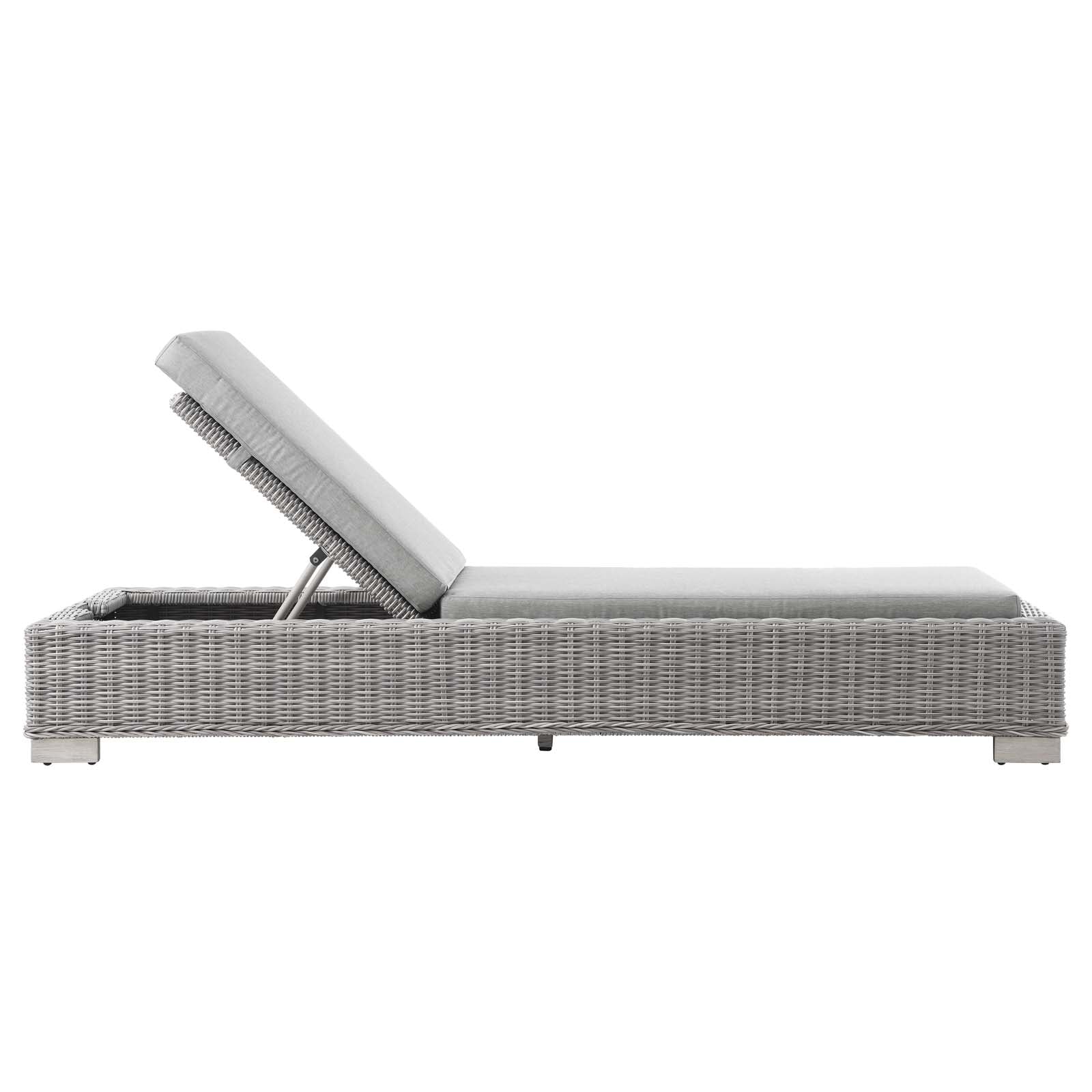 Enjoy fresh air and alfresco relaxation with the Conway Outdoor Patio Wicker Rattan Chaise Lounge Chair. Wrapped in UV-resistant light gray synthetic wicker rattan, this lounge chair boasts organic texture and a neutral hue that brings a calming presence to your outdoor space. With four different reclining positions, the frame of this outdoor chaise lounge is crafted with durable powder-coated aluminum and rests on L-shaped legs with plastic foot glides. Thick foam padded cushions covered with removable, water-resistant polyester covers offer a comfortable seat and affix securely to the lounge chair with cord tension attachments. Trending aesthetics and a classic design define this outdoor patio furniture collection making it a beautiful addition to any outdoor space including the backyard, patio, porch, balcony, or poolside. Assembly required. Chaise Lounge Weight Capacity: 600 lbs.