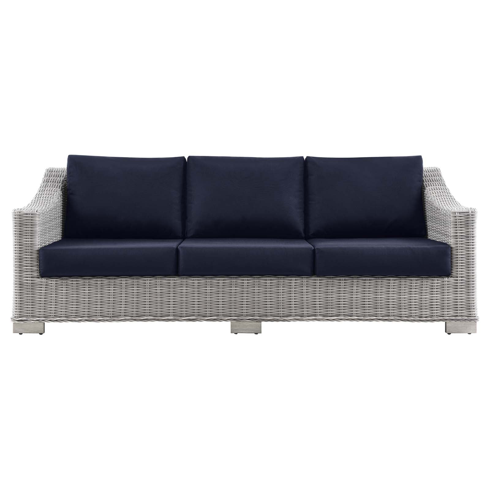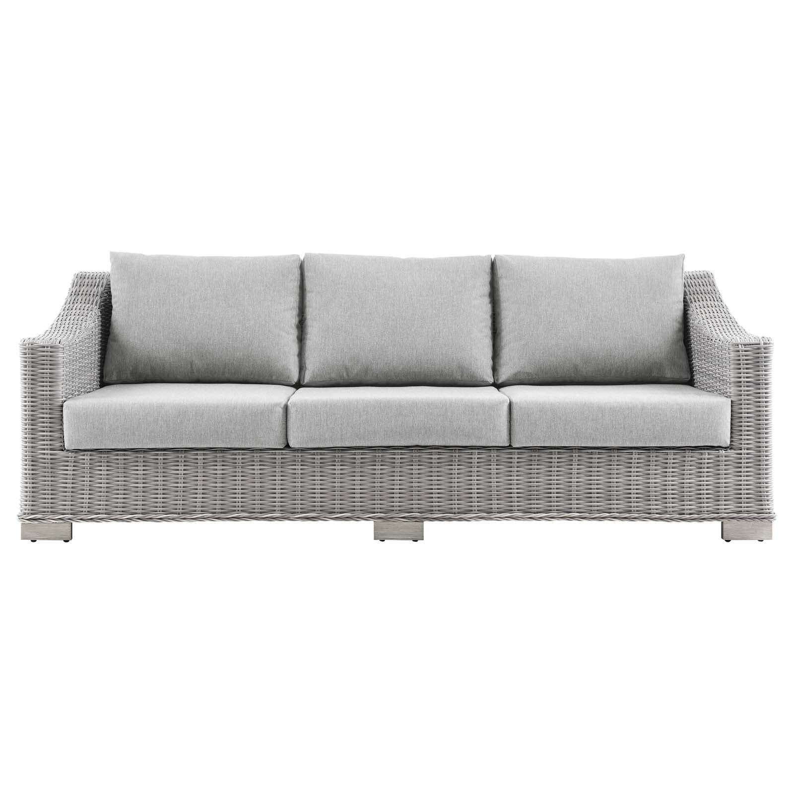 Transform your outdoor living area into a serene retreat with this stylish and durable patio wicker rattan sofa. Designed for alfresco relaxation, this sofa features a UV-resistant synthetic wicker rattan wrap in a soothing light gray tone, adding an organic texture that enhances the beauty of your outdoor space. The robust frame is crafted from powder-coated aluminum, ensuring longevity and stability, while the L-shaped legs with plastic foot glides provide a sturdy foundation for your comfort.
