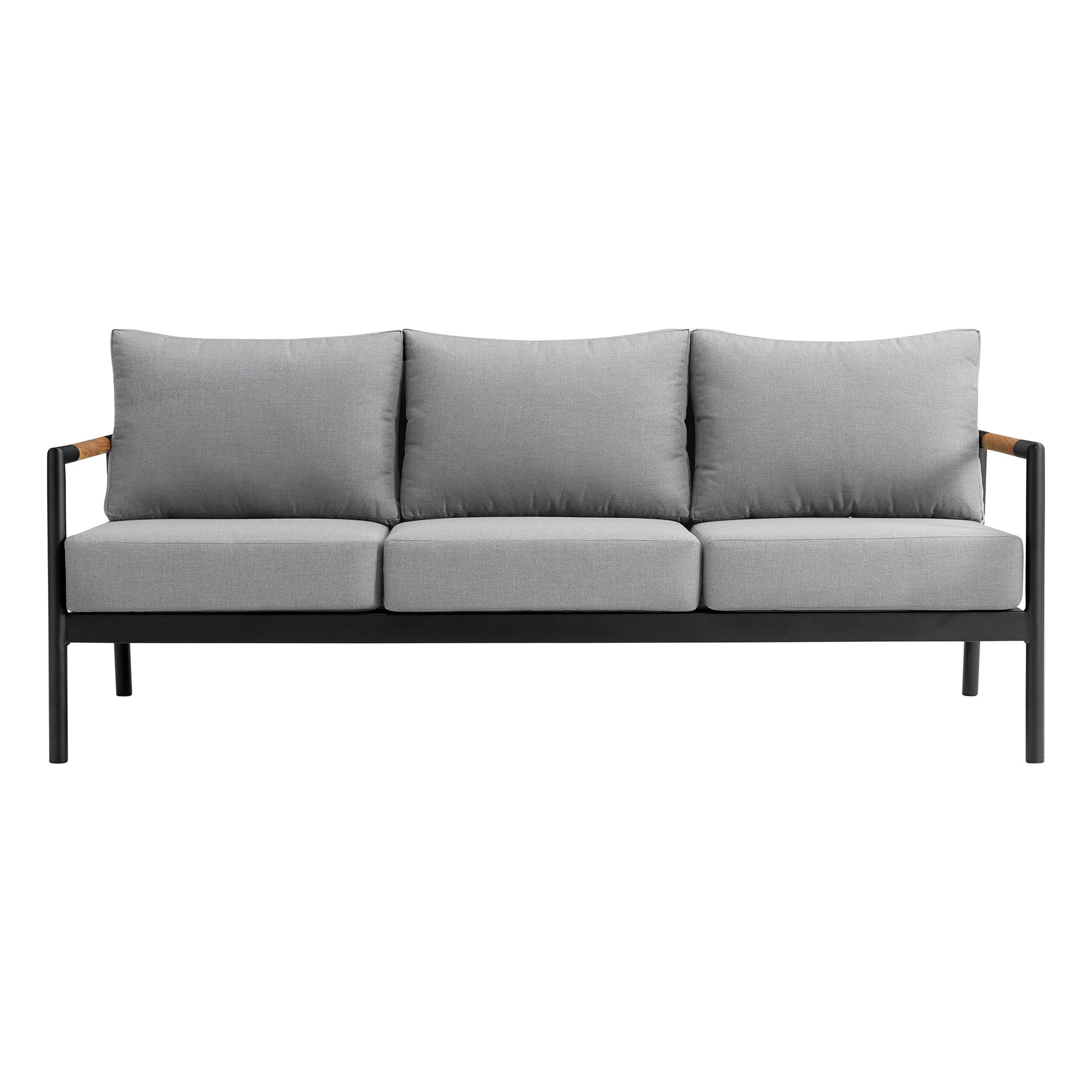 The Crown 4 Piece Aluminum and Teak Outdoor Seating Set with Cushions suits all your needs when it comes to outdoor lounging. Complete with a sofa, 2 club chairs, and a coffee table, this set is ideal for seating up to 5. UV and water-resistant upholstery allow the Crown set to last for many years to come and the convenient zipper closure on the cushions makes clean up a breeze! The teak accents on the sofa and chair arms match the table and give a warm touch to the overall modern design. The Crown 4 Piece Aluminum and Teak Outdoor Seating Set with Cushions is available in your choice of a black aluminum finish with dark gray cushions or white aluminum finish with light gray cushions.