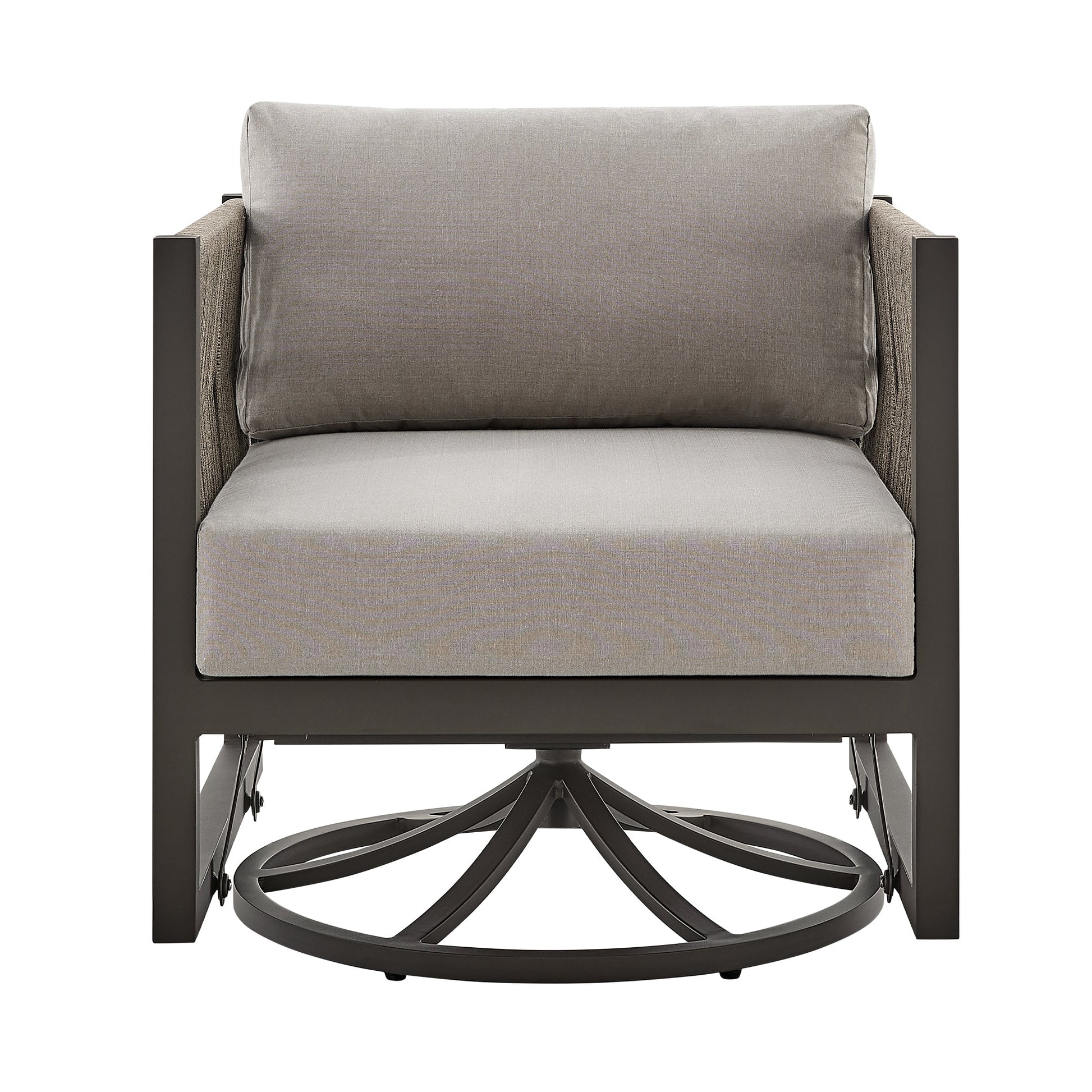 Style and mobility come together with the Cuffay Outdoor Patio Swivel Lounge Chair in Aluminum with Rope and Cushions. This 360-degree swivel and gliding functionality add comfort, further enhanced with the high-density foam cushions. The durable materials come together beautifully to create a long lasting and fashion forward seating experience. The aluminum frame is ideal as aluminum cannot rust. This is especially beneficial in areas where moisture is present, making it a premium choice among residents of coastal cities or regions with high humidity. Polyester fabric is very easy to clean. This makes it a good option for outdoor cushions that will probably be covered with dust, dirt, and other outdoor grime regularly. In addition, most outdoor furniture is used as part of an eating area, making more stains and messes a real possibility. Polyester cushion covers can be thrown in the laundry and are naturally difficult to stain permanently. These weather resistant materials will stand up against UV, rain, and sun. The Cuffay swivel outdoor lounge chair is available in your choice of a black aluminum finish with gray rope and cushions, or a brown aluminum finish with brown rope and cushions.