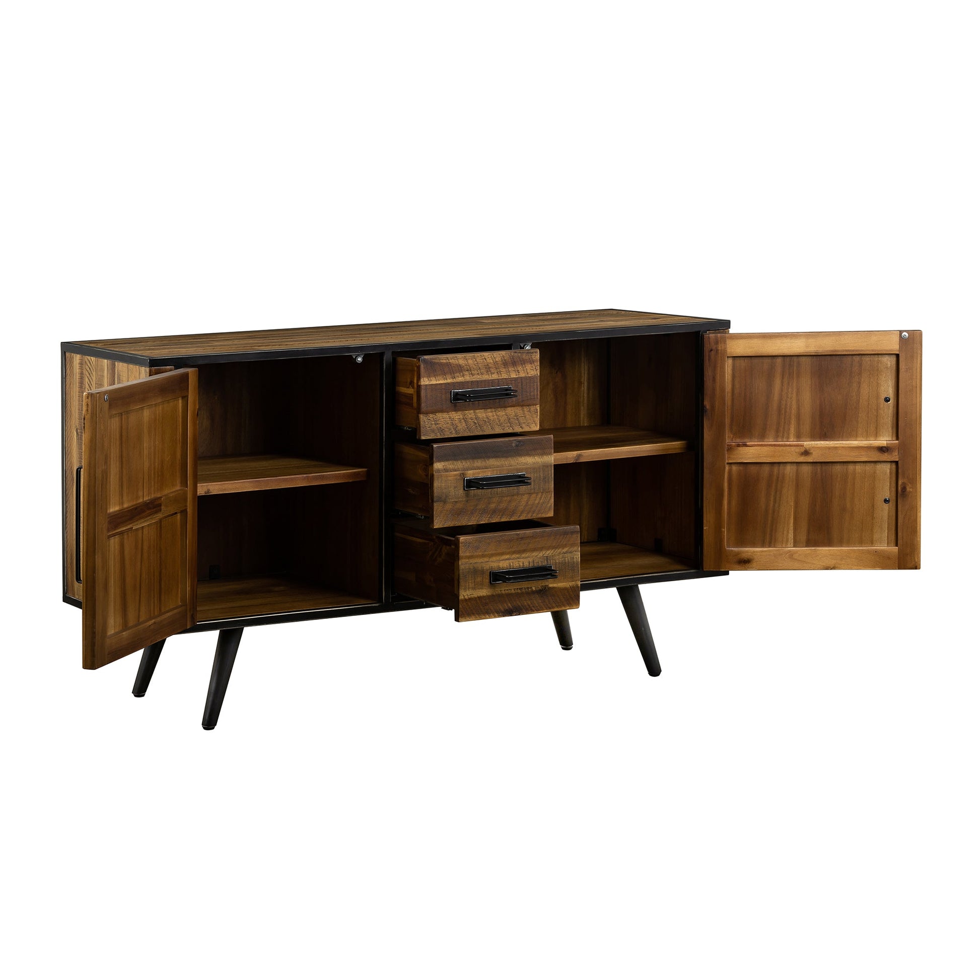 The Armen Living Cusco Acacia Rustic Buffet Cabinet is a stunning piece to add to your dining room or living room. 57 inches in width, this cabinet offers tons of surface space for entertaining and serving. The cabinets and drawers offer a variety of storage options. The metal legs give this item a modern touch without compromising the warm rustic aesthetic. The Cusco collection expands to multiple rooms in your home. Coordinating bedroom, living room and dining room pieces not included. All available in an antique acacia finish with black metal accents.