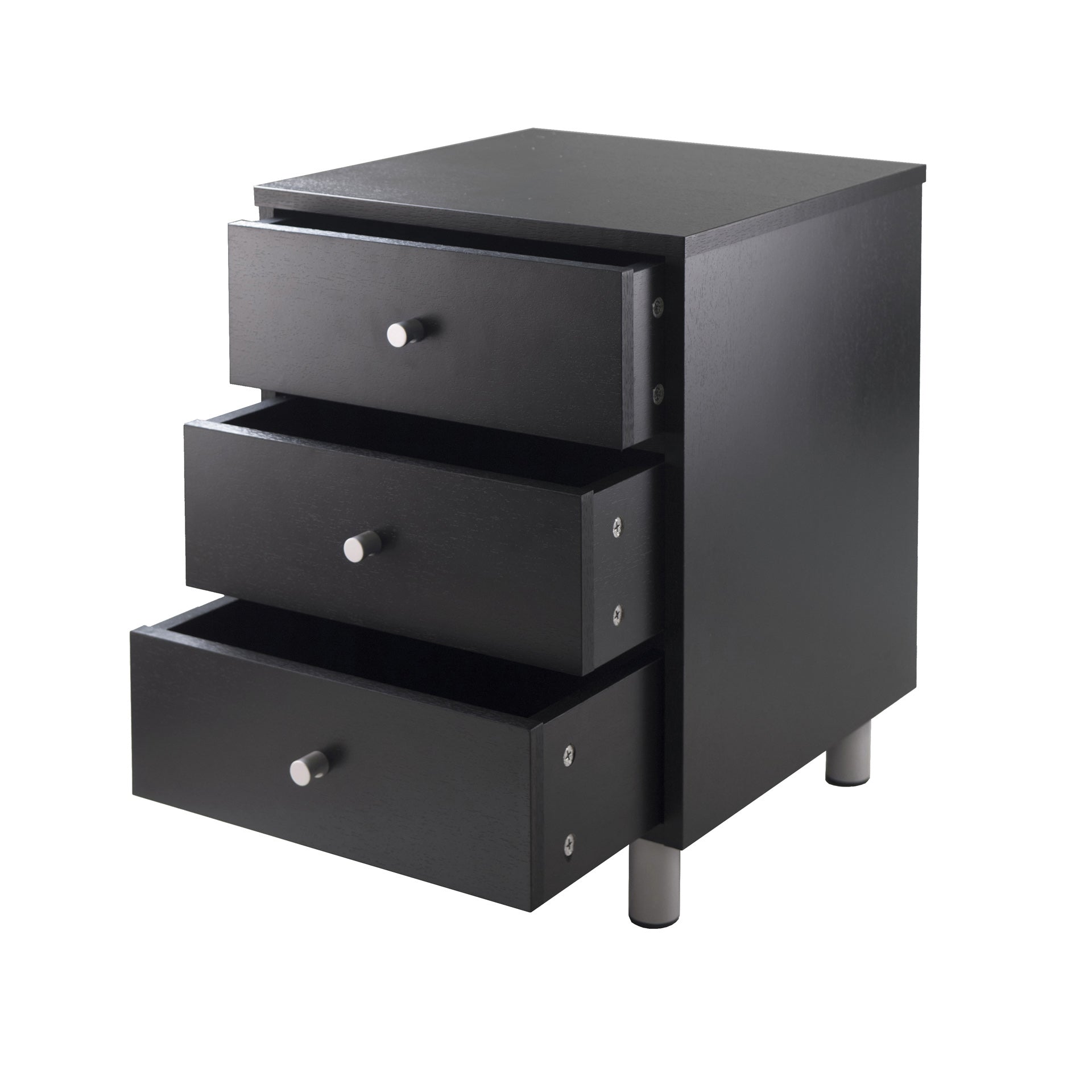 Keep it simple with the Daniel Nightstand by Winsome. Its clean, contemporary design will spruce up the bedroom or guestroom, or use it as a side table in the living room. In smaller areas, the compact width of 15.7"W offers an opportunity for a nightstand on both sides of the bed but still with plenty of tabletop space for a reading lamp, a couple of books, and a place to charge your phone. Best of all, the nightstand has three drawers to keep bedtime essentials out of sight, providing your room with uncluttered calm. The unit is made of composite wood with a sleek, Black veneer. The brushed metal knobs and dowel legs with protective floor coverings give this unique piece the finishing touches. Conveniently packed and shipped in 1 box, that includes the hardware needed for assembly.