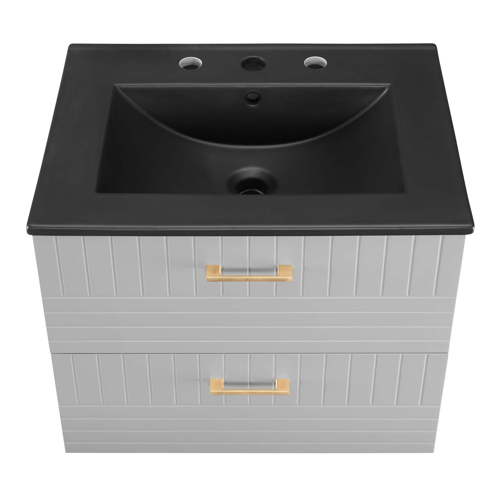 Refresh your bathroom space with the contemporary style of the Daybreak 24" Wall-Mount Bathroom Vanity. Featuring a modern silhouette, sophisticated matte finish, and brushed gold metal hardware, this vanity is durably crafted with a blend of rubberwood, MDF, and particleboard to create a lasting vanity for your bathroom. Mounting directly to your wall and saving substantial floor space, this bathroom vanity is complete with ample storage in its spacious drawers to accommade bathroom essentials and features a special design for plumbing. The vanity comes with a ceramic sink basin with 8-inch centerset holes and an integrated countertop. Includes non-marking foot caps. Assembly required. Fixtures not included.