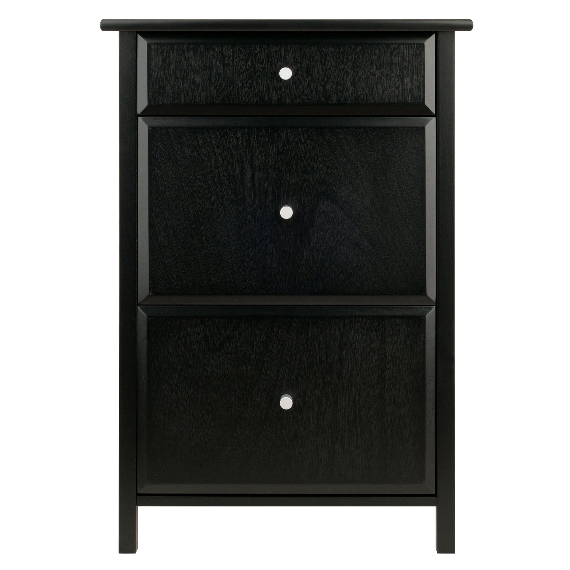 Keep your office in order with the Winsome Wood Delta Home Office File Cabinet. The sleek black finish and silver accent knobs give this versatile piece a handsome, yet casual feel that will transform your home office into an inviting place to work. This file cabinet provides convenience in a classic and sturdy form. It’s simple, no-fuss design works well in the home office providing you with plenty of storage for a variety of files and office necessities. There is substantial space for your important files and paperwork. Store both legal and letter sized files in the two bottom drawers or simply use as another storage drawer. The top drawer is perfect for smaller items, such as envelopes, pads and pens. Create a relaxed, stylish setting by completing your office space with the additional items from the Winsome Delta collection (each sold separately). Conveniently ships in one box and ready to be assembled. Replacement part request can be submitted directly to the manufacturer within 60 days from date of purchase.Dimensions : 20.87 in. Wide 20.24 in. Deep 30.71 in. High