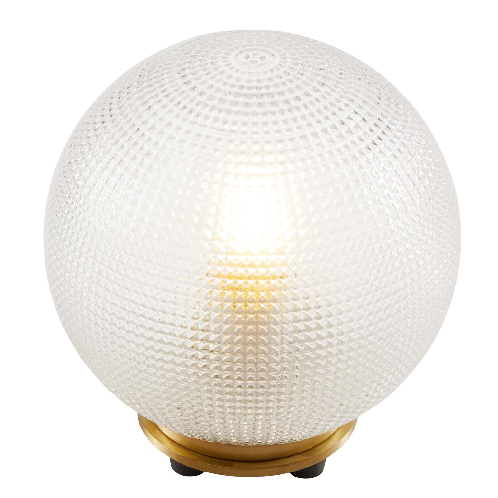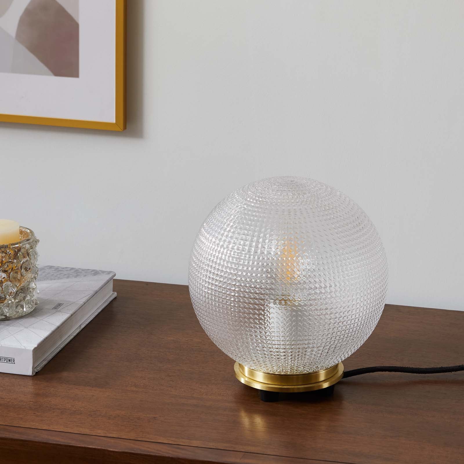 The globe-inspired Destiny Frosted Glass Table Lamp radiates with contemporary clarity in your bedroom, living room, or office space. This side table lamp features a transparent glass orb shimmering with geometric texture and rests on a satin brass base. Destiny is a coffee table lamp displaying a crisp minimalistic aesthetic in mid-century modern, contemporary, or eclectic decors. The round iron base rests on four black rubber legs and comes fitted with a black power cord with an easy access on/off switch. The Destiny Table Lamp requires 1 E26 60W max bulb or LED equivalent (not included). Compatible with dimmer switches (not included). Clean with a soft, damp cloth.