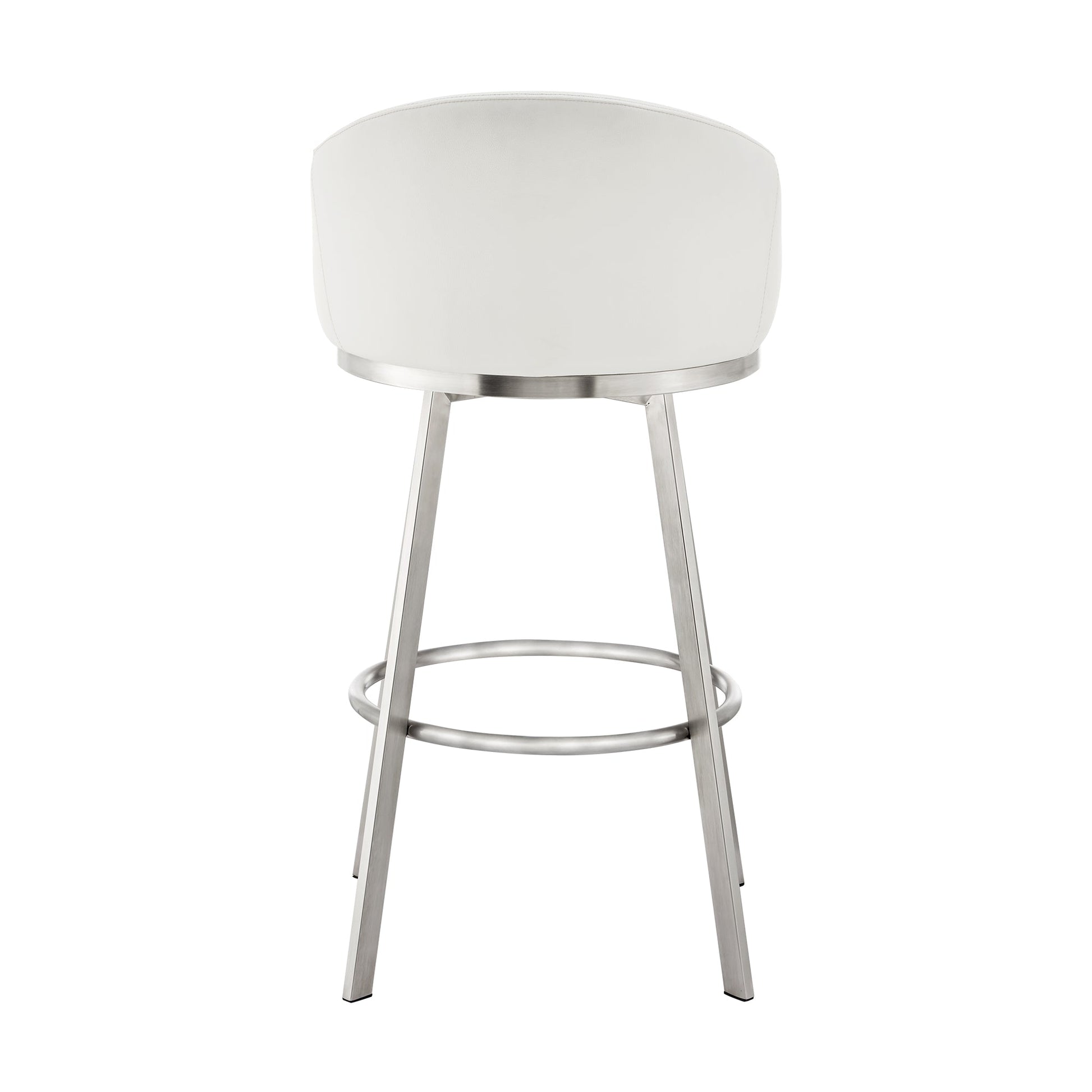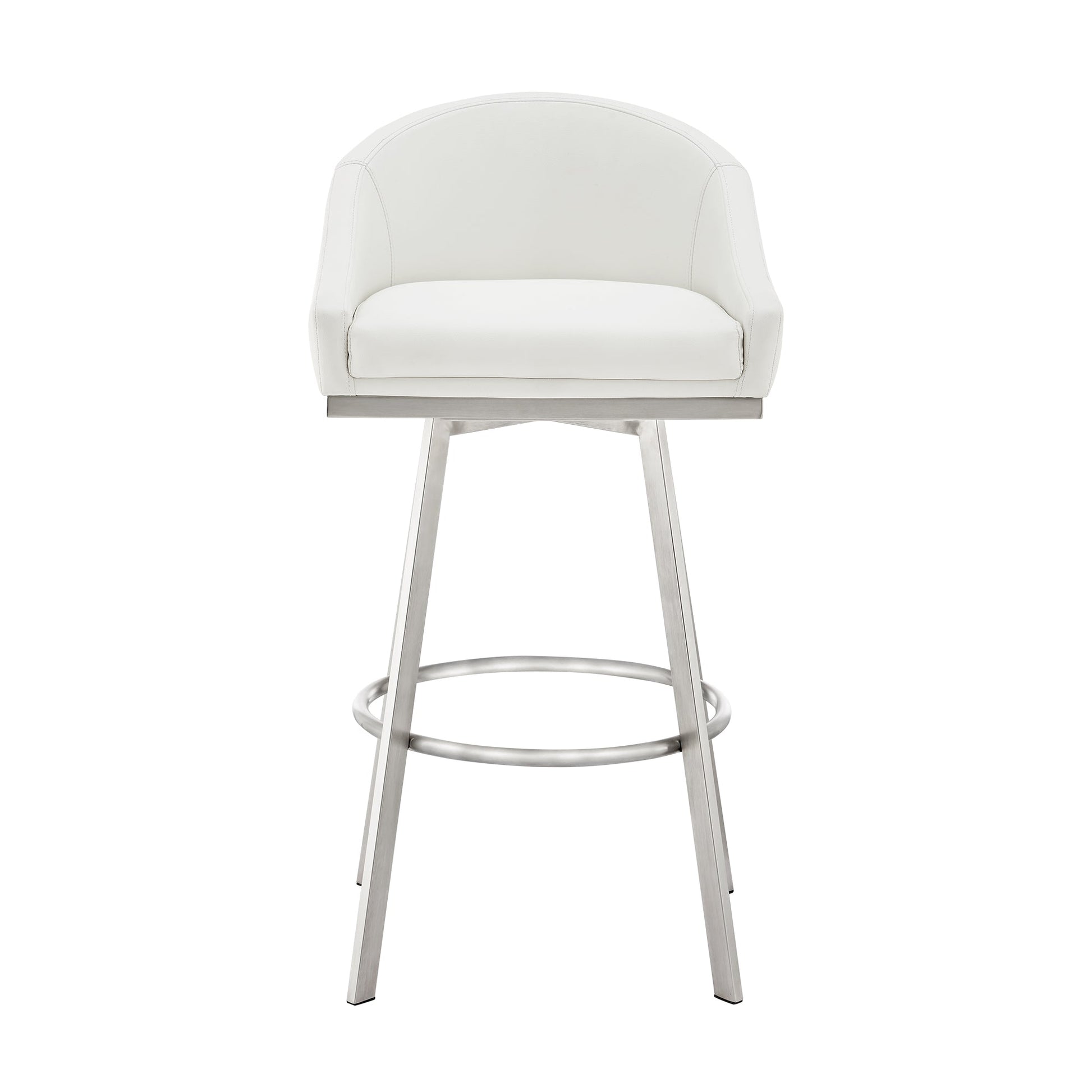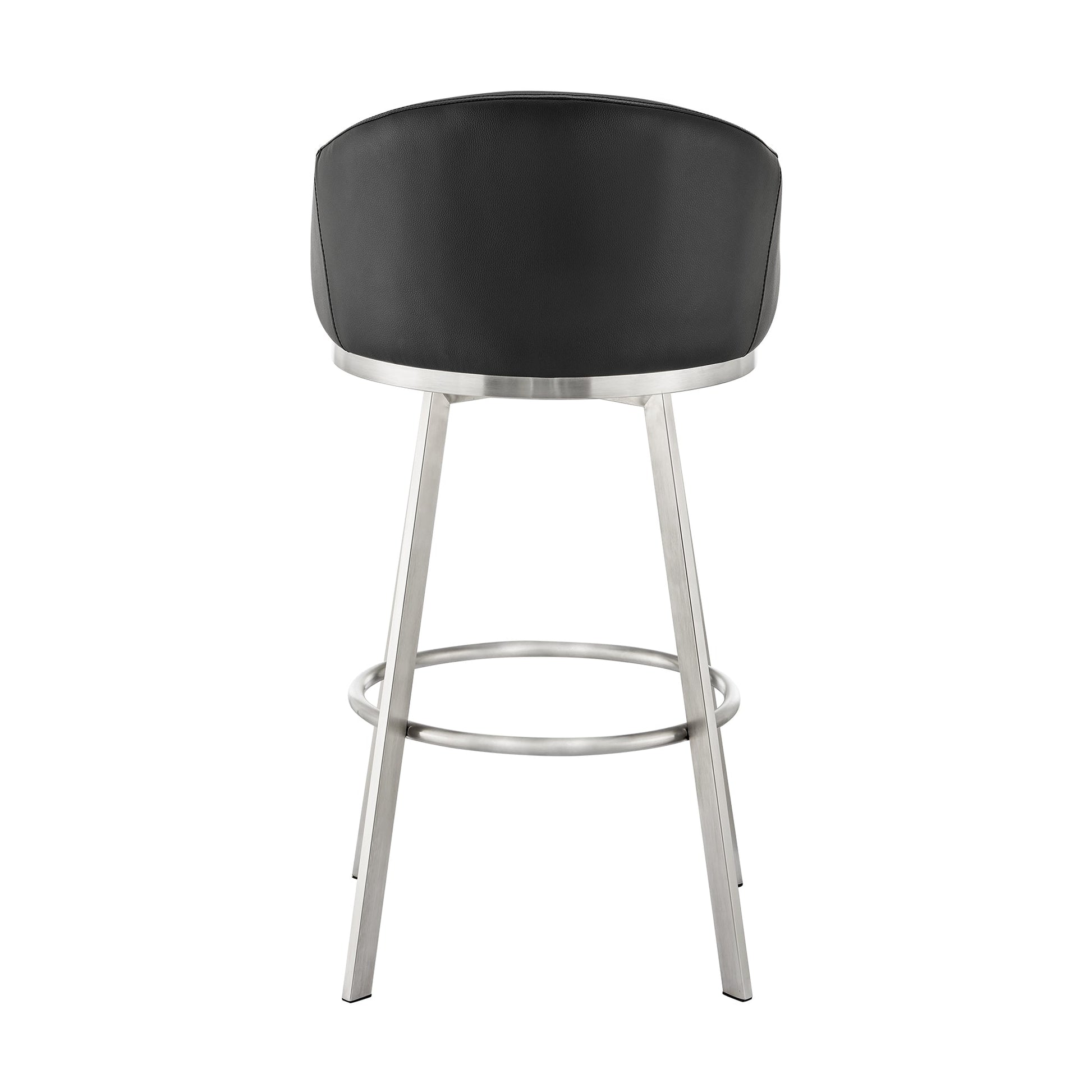Transform your space with the perfect blend of style and comfort offered by this elegant swivel stool, available in both counter and bar heights. Crafted by Armen Living, this stool features a sleek barrel-style seat upholstered in durable faux leather, ensuring resistance to cracking, staining, fading, and UV exposure. The sturdy 4-leg metal base, finished in brushed stainless steel, provides exceptional stability and a contemporary touch to any setting.