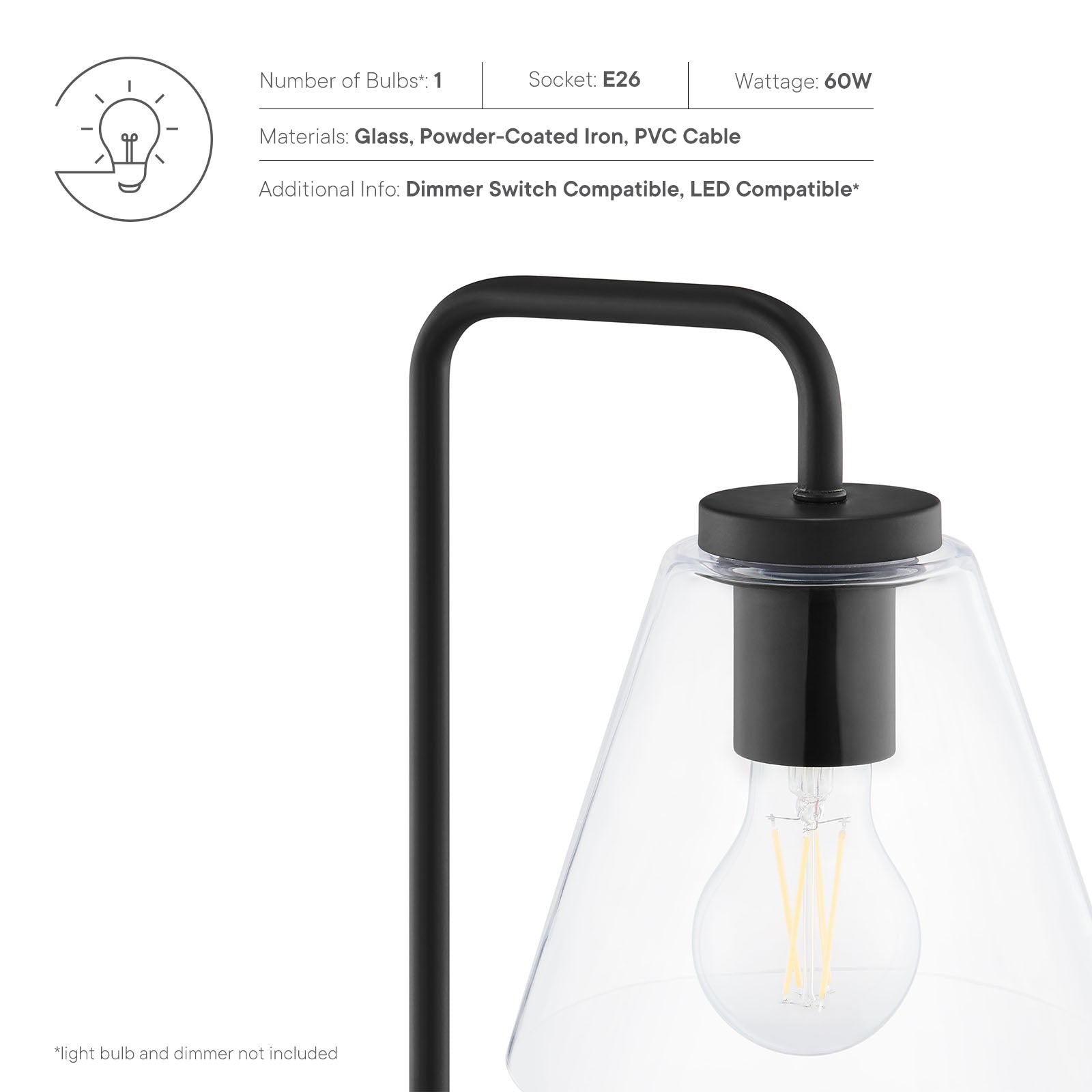 The Element Glass Table Lamp accentuates your home décor in the living room, bedroom, office, or study room with its distinctive mid-century modern aesthetic. This side table lamp brings farmhouse appeal to mid-century modern, contemporary, rustic, or eclectic decors, boasting a classic transparent glass cone shade. An ideal desk lamp for the home office, Element is solidly constructed with a bent-pipe arm and a round iron base. This dimmable coffee table lamp is equipped with a black power cord and a convenient on/off switch. Requires 1 E26 60W max bulb or LED equivalent (not included). Compatible with dimmer switches (not included). Assembly required. Clean with a soft, damp cloth.