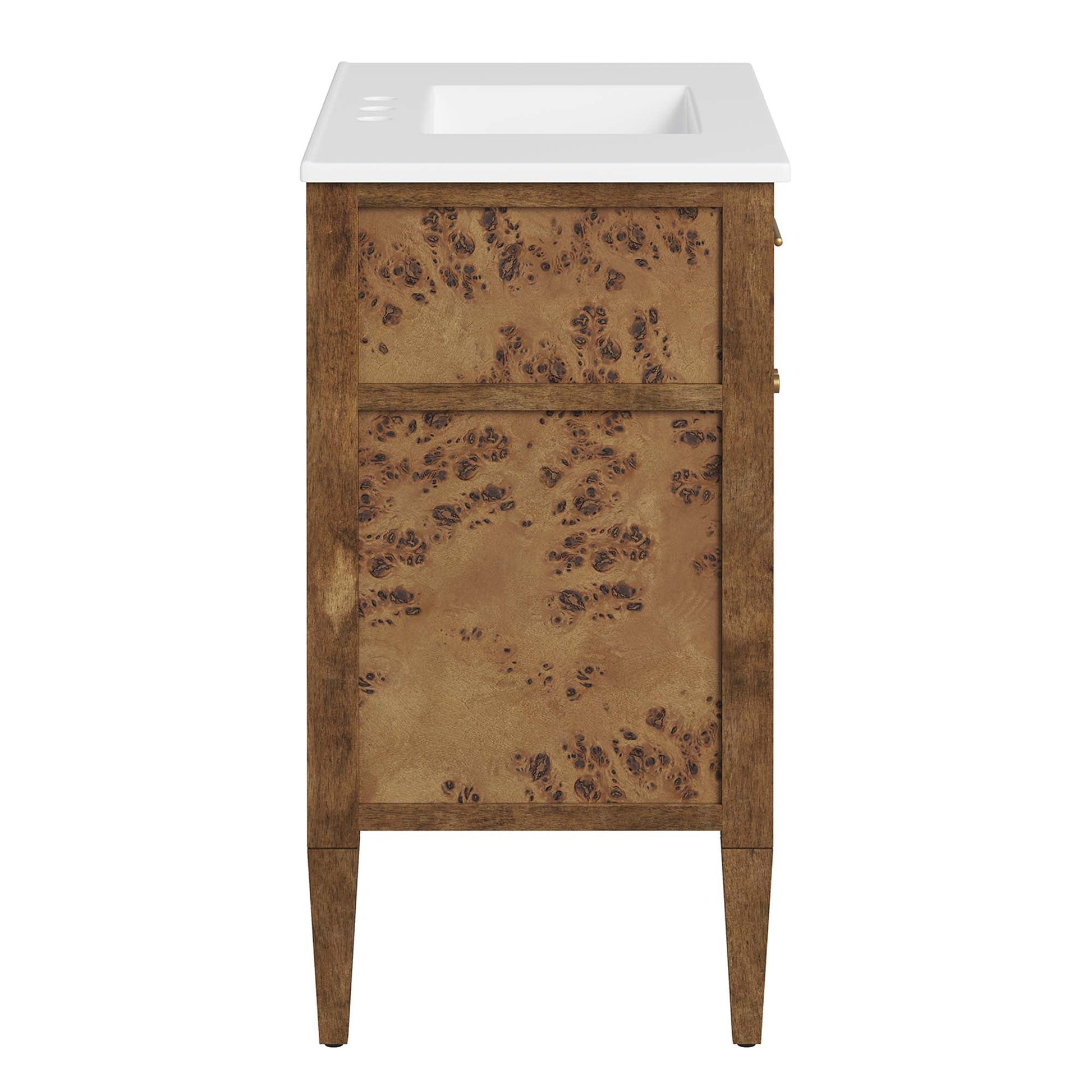 Discover the epitome of organic aesthetics and practicality with the Elysian 36" Burl Wood Bathroom Vanity. Each vanity cabinet is uniquely crafted from exquisite mango wood, further adorned with a rich burl wood veneer, radiating a distinctive charm and character. This bathroom vanity's centerpiece is an elegant ceramic sink basin, thoughtfully designed with an integrated countertop and 8" centerset holes ready for your choice of fixtures (not included). A fixed top drawer and tapered wood legs add to the sleek design, while the spacious shelving beneath–complete with a convenient plumbing cutout–offers ample storage space for all your bathroom essentials. While assembly is required, this vanity includes easy-to-follow assembly instructions. Overall Product Dimensions: 18.5"L x 36"W x 39.5"H