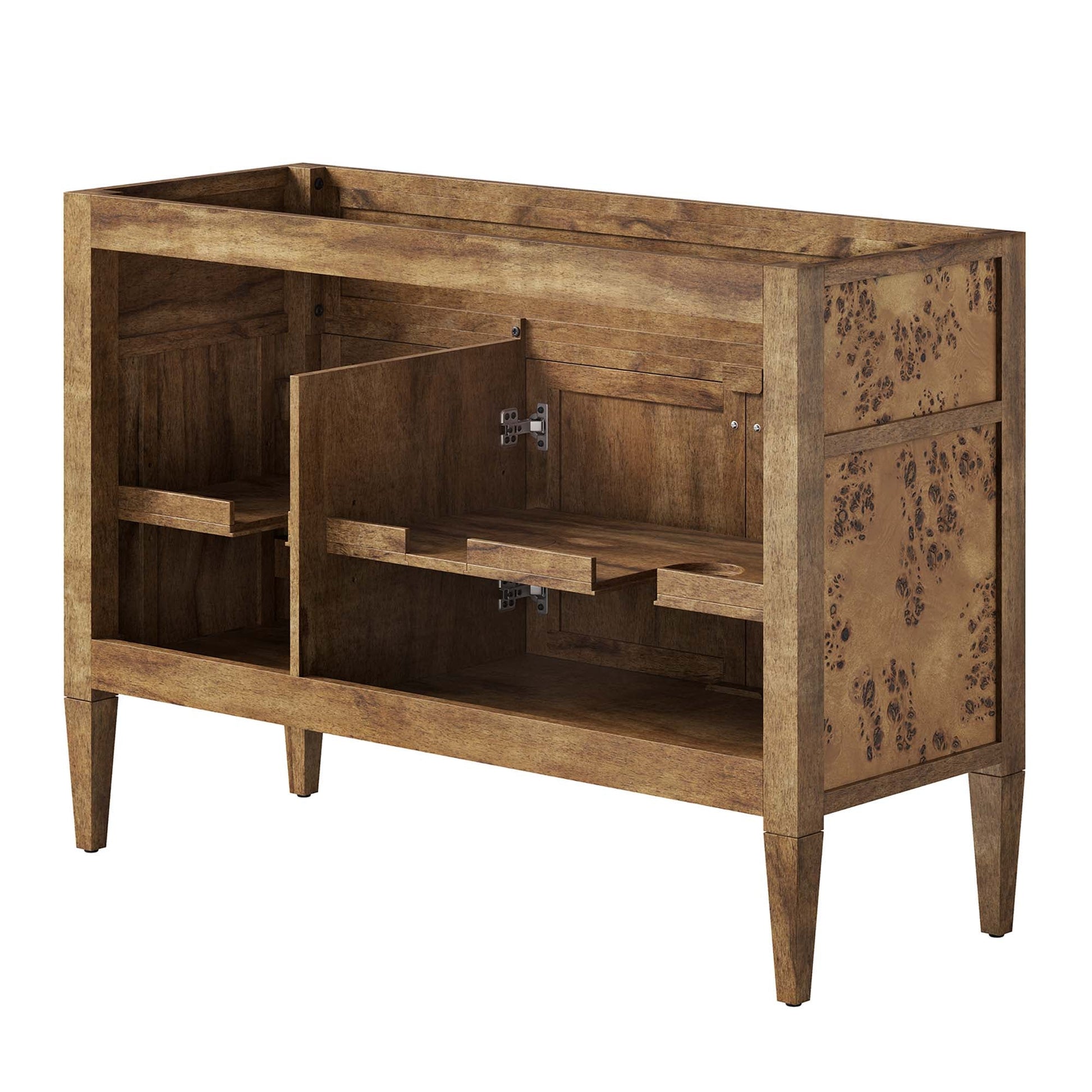 Discover the epitome of organic aesthetics and practicality with the Elysian 48" Burl Wood Bathroom Vanity Cabinet. Designed for use as both a single or double sink vanity, this vanity cabinet is uniquely crafted from exquisite mango wood, further adorned with a rich burl wood veneer, radiating a distinctive charm and character. A fixed top drawer and tapered wood legs add to the sleek design, while the spacious shelving beneath–complete with a convenient plumbing cutout–offers ample storage space for all your bathroom essentials. While assembly is required, this vanity includes easy-to-follow assembly instructions. Sink basin and fixtures not included. Overall Product Dimensions: 18"L x 48"W x 33"H