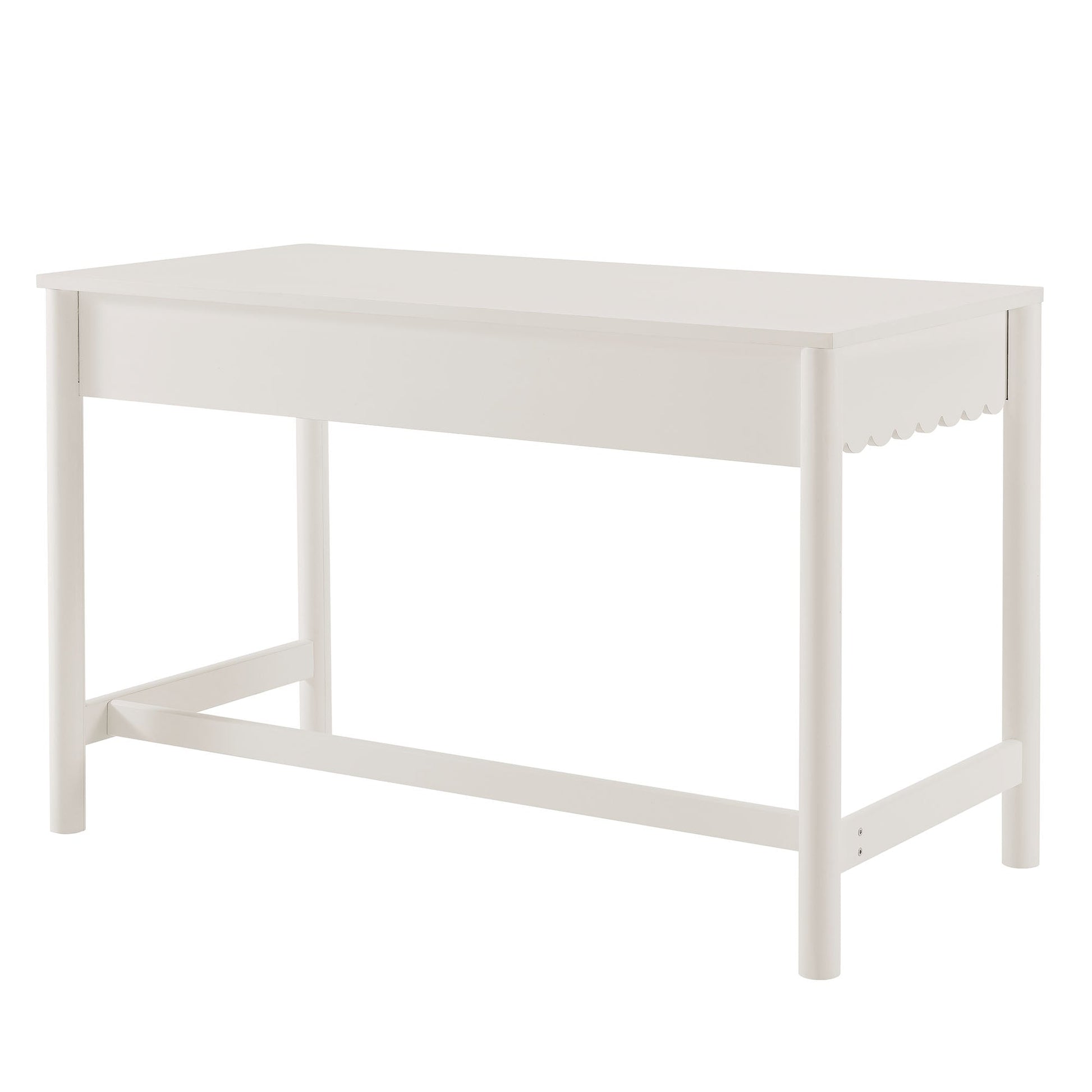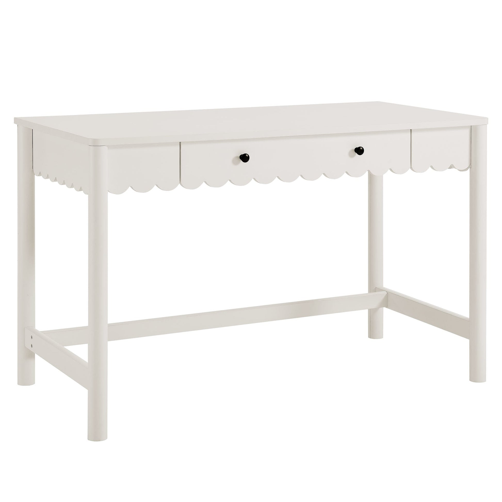 Elevate your workspace with the charming design of a scalloped writing desk that seamlessly blends modern farmhouse aesthetics with functionality. This writing desk features a beautifully crafted full-glide drawer adorned with a playful scalloped edge, making it not only a stylish addition to your home but also a practical solution for organization. The smooth surface provides ample area for writing, working, or setting up your computer, while the uniquely designed wavy drawer front offers convenient storage for office supplies, notebooks, or even makeup essentials.