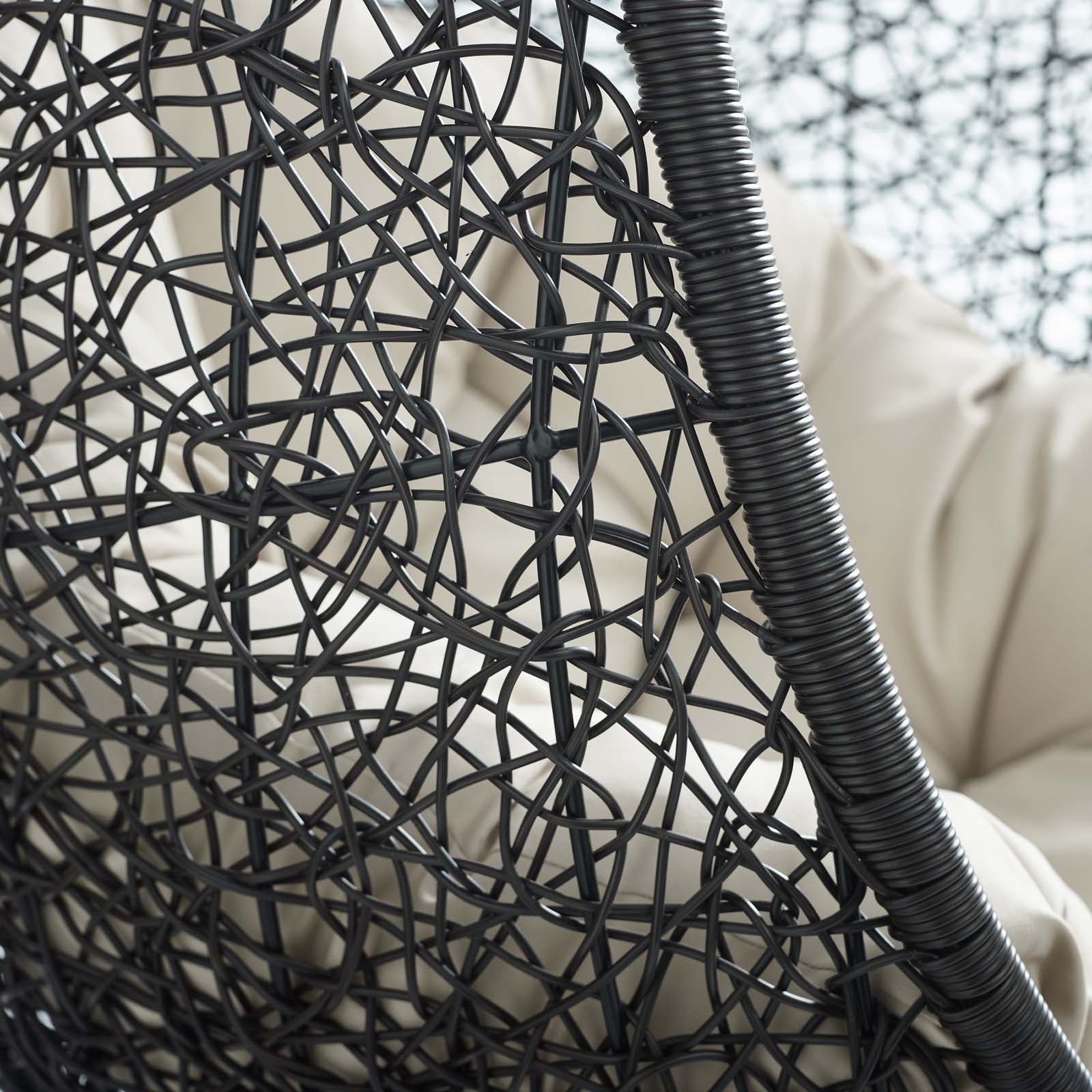 Embark on moments of metamorphosis and rebirth with an exotic hanging outdoor swing chair. Transform the mundane to heightened states of consciousness with Encase Outdoor Swing Chair. This hanging swing chair is comprised of a sturdy espresso metal stand and rattan seat. Surround yourself with plush fabric cushions to complete entry into a relaxed state in the Encase Hanging Chair.