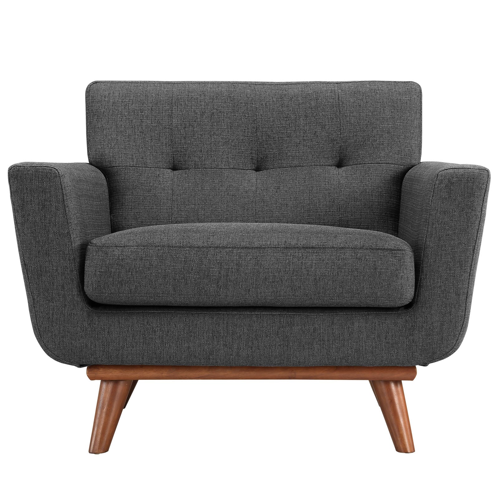 Gently sloping curves and large dual cushions create a favorite lounging spot. Whether plopping down after a long day at work, settling in with coffee and brunch, or entering a spirited discussion with friends, the Engage armchair is a welcome presence in your home. Seven tufted buttons create eye-catching appeal, adding depth that brings your sitting décor to center stage. Four cherry color rubberwood legs and frame supply a solid base to the comfortable upholstered material.