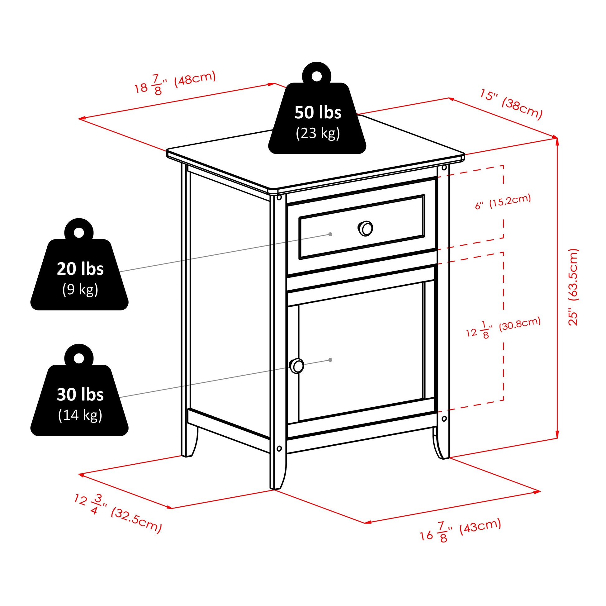 Add extra table space to a living room, den or bedroom with the versatile and ageless design of the Winsome Wood Eugene Accent Table. Whether you decide to put your alarm, lamp or family photo, the clean and simple design of this table allows it to blend well with most home decor. This Winsome classic is finished in rich walnut and adorned with two satin nickel knobs for a sticking contrast of elegance. Featuring a small pull-out drawer for storing pens, notepads, remote control and small accessories, organized and out of sight. The bottom door opens up to more storage space. Keep photo albums accessible or some of your favorite night time storybooks within reach in the spacious compartment. For larger beds, sofas and/or rooms, try adding one accent table on each end (each sold separately). Like many Winsome Wood products, the Eugene collection is available in four classic finishes to choose from. Conveniently packed and shipped in 1 box and ready to assemble. Constructed of a combination of composite wood and solid beech wood top panel and frame for a long-lasting durability. Replacement parts can be requested directly to the manufacturer within 60 days from date of purchase. Dimensions : 18.9 in. Wide 14.96 in. Deep 25 in. High