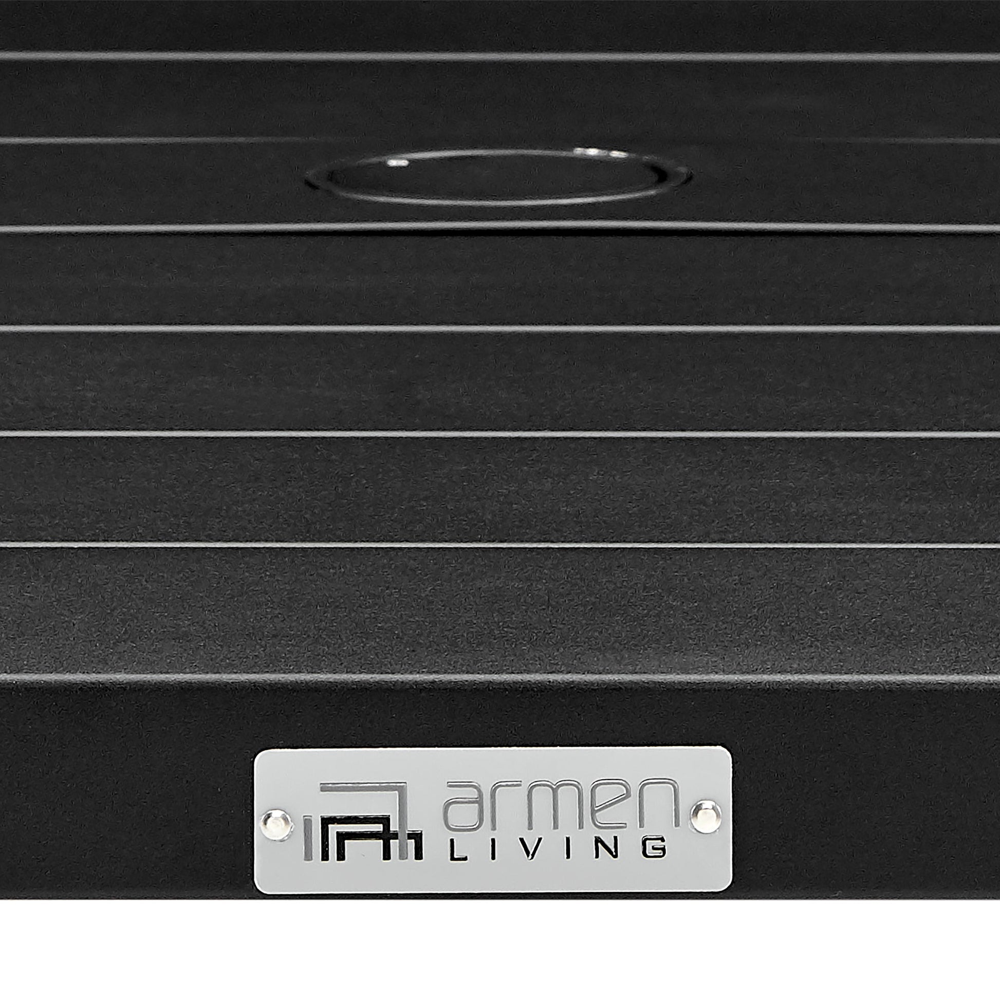 Enjoy your outdoor space to the fullest with the Ezra outdoor dining table from Armen Living. Defined by clean lines and refined silhouette, the patio dining table befits any setting. The surface of the table rests upon sleek, tapered legs to deliver timeless elegance and aesthetic to this outdoor furniture piece. The chic aluminum table and frame feature a multi-layer powder coating for effective protection from the weather, everyday wear, and tear. Aluminum is a light and rust proof material and can be moved from your backyard, to your screened in porch, to your garden with ease! The slat style tabletop helps elements to easily pass through which adds to its durability, while the umbrella hole adds to its convenience. The dining table makes a sleek statement with the smooth and sturdy finish of black powder-coated aluminum, and it can easily incorporate to your existing décor, making it the ideal piece of outdoor patio furniture. Crafted to perfection, our Ezra outdoor dining table can accommodate up to 6 seats.