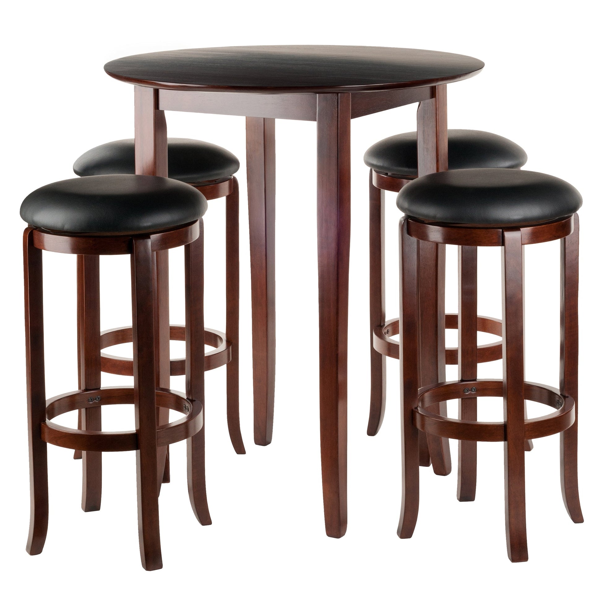 For smaller spaces, the Winsome Wood Fiona Dining set is a smart choice. This round pub table is well-suited for small condos, apartments and studios. Bring a touch of casual café dining to your kitchen, den or basement. Compact yet sophisticated style of this set makes it a great addition to any area; ideal for light dining or social gatherings. Design with tapered legs this table offers exceptional versatility, making this an excellent space saving choice where a multipurpose table is ideal. Constructed of sold wood in a walnut finish, table is 38.98" tall and accomodates the four matching bar stools perfectly. The bar stools included with this set have a heavy-duty ball bearing swivel and a round, black faux-leather PVC upholstered cushion and a solid wood frame in walnut. Table and stools are packaged indiviudally and will each include the hardware necessary for assembling. Dimensions : 33.66 in. Wide 33.66 in. Deep 38.98 in. High