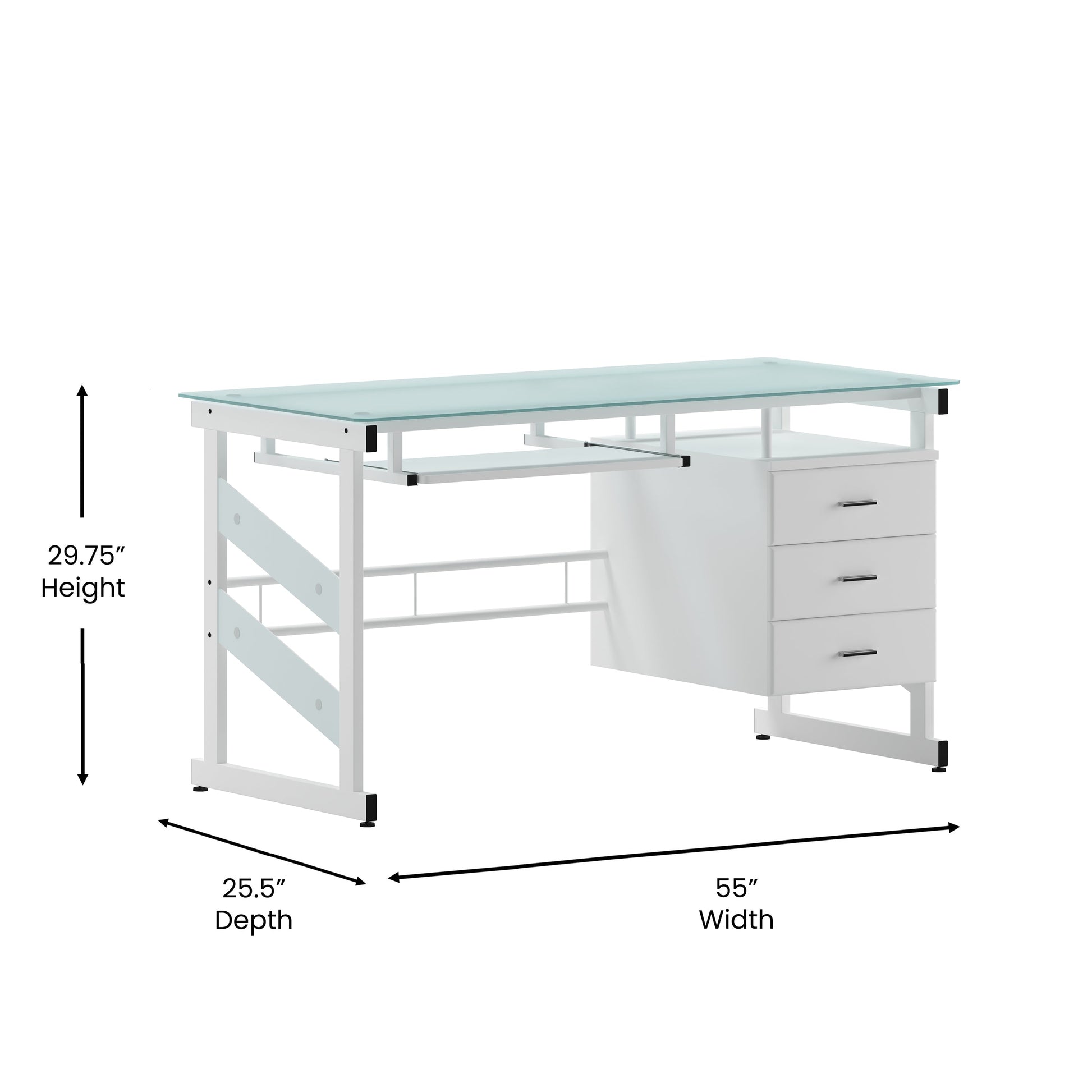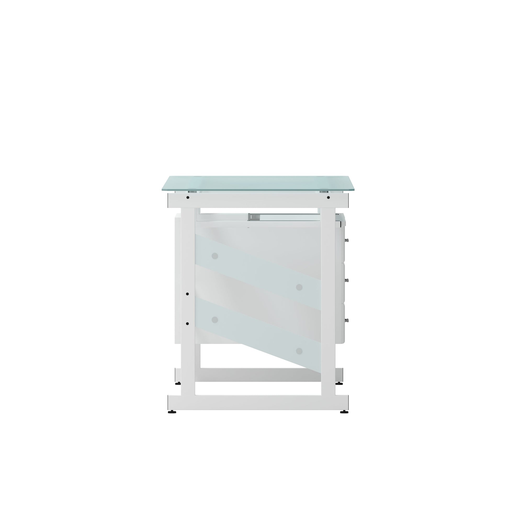 Singleton White Computer Desk with Frosted Glass Top and Three Drawer Pedestal Dimensions: 55"W x 25.5" - 33"D x 29.75"H