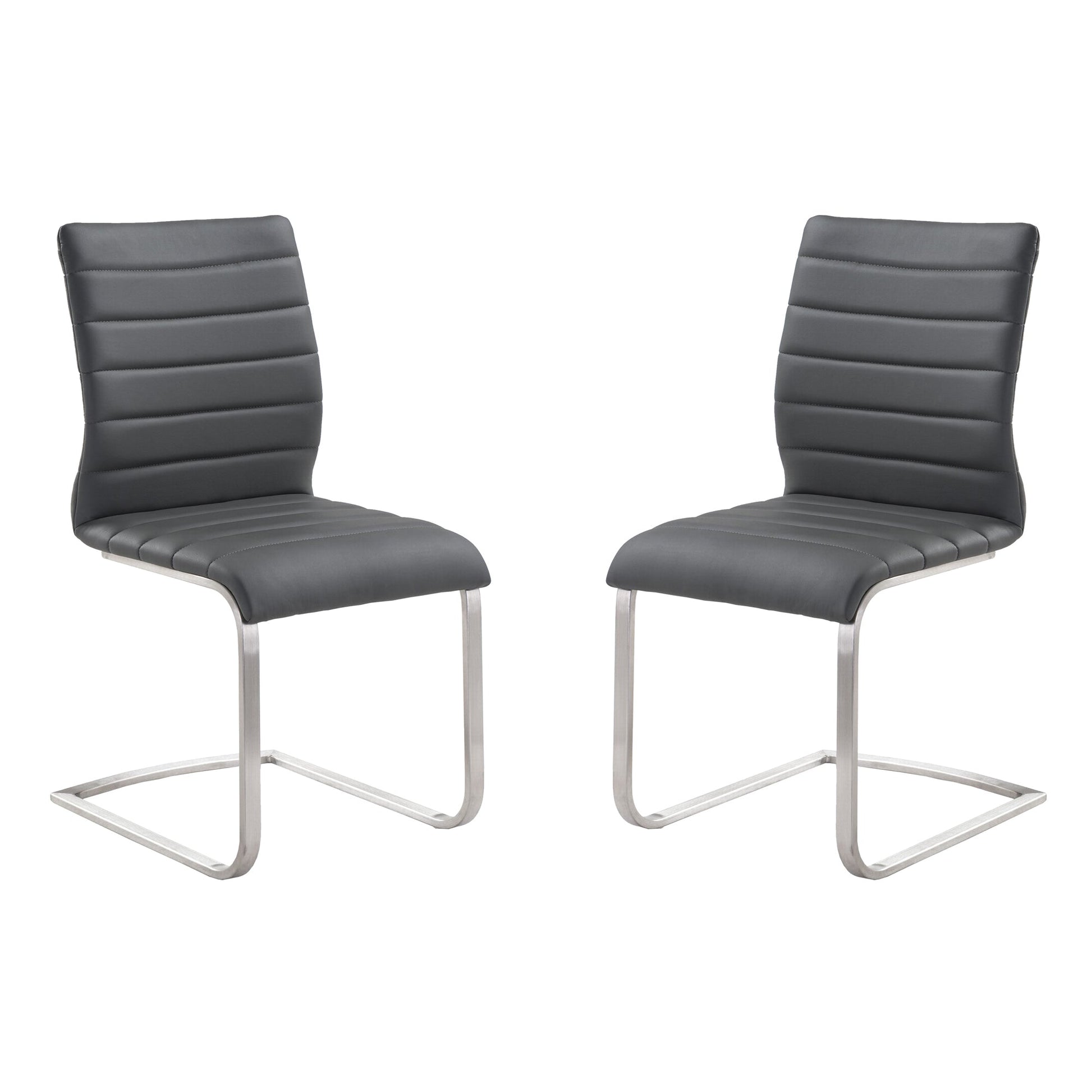 The Armen Living Fusion contemporary Set of 2 dining chairs are sure to be a standout in any modern household. The exquisite combination of brushed stainless steel and plush faux leather upholstery makes this chair both comfortable and dependable. The cantilever base with curved legs add a unique spin on the traditional dining chair design while the back and seat add an unmatched degree of luxury. The Fusion dining chair can be paired with the complementary Fusion dining table. This piece provides both versatile style and comfort with a Contemporary and Modern design that can easily be integrated into your home's current décor. The horizontal stitch padded seat with high density foam will provide you with all day comfort. The padded high back is ideal for posture alignment and an unmatched support for days on end. The foundation of the product is supported by stainless steel for a chic and stylish aesthetic without comprising practicality and functionality of this item. This product ships in one box with easy and quick set up. We stand by the quality, the craftsmanship and the integrity of our product by offer 1-year warranty for all our products. We want our customers enjoy our product and we will always be there to help with our top-notch customer service support. Excellent choice for a Modern, Contemporary and traditional Dining, living room or Kitchen setting. The Fusion dining chairs are available in white and gray leatherette/faux leather. Product Dimensions: 18"W x 22"D x 37"H